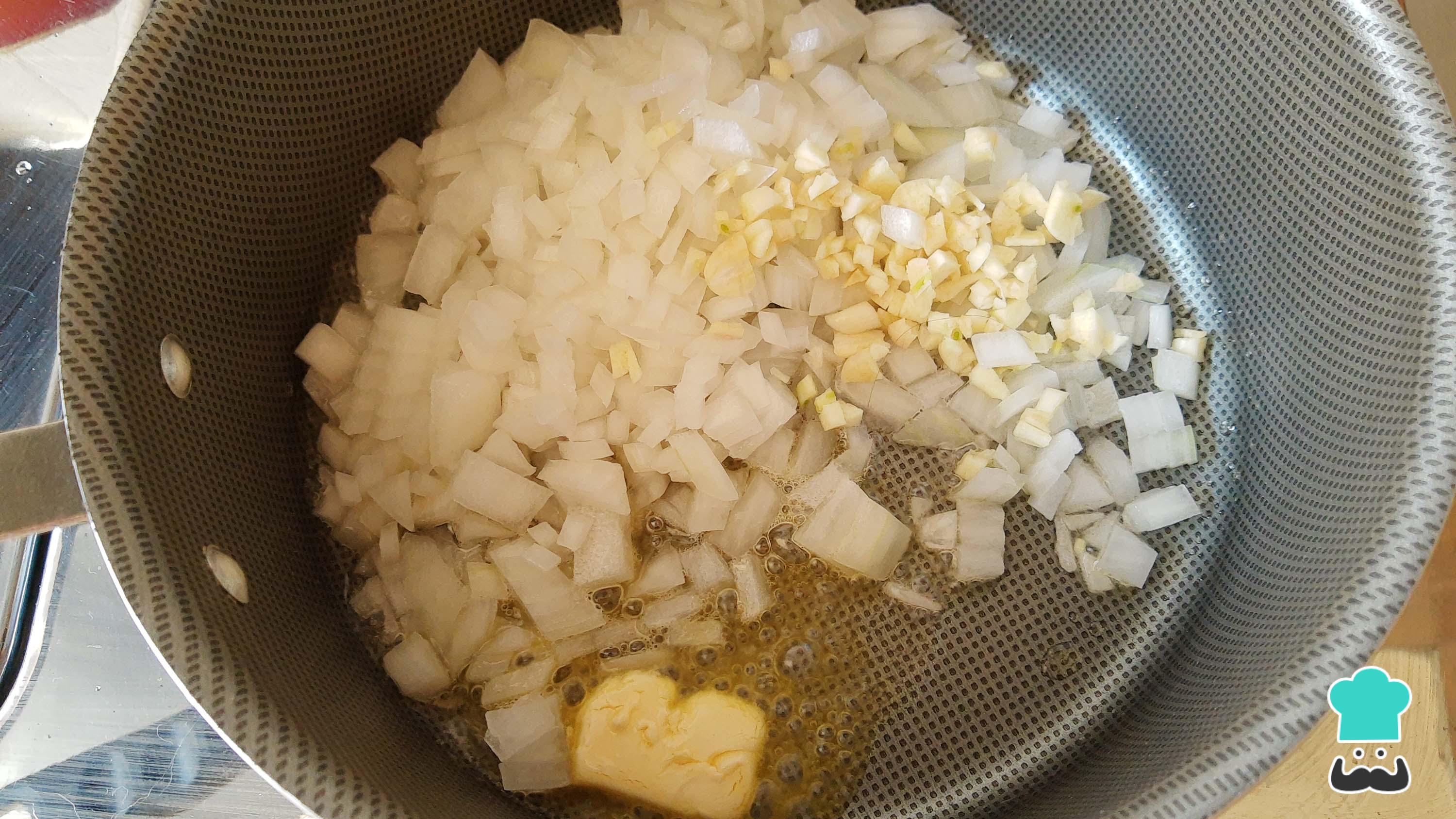 Calienta un chorrito de aceite con una cucharada de mantequilla en una olla o sartén. Sofríe la cebolla y los dientes de ajo picados hasta dorar ligeramente.