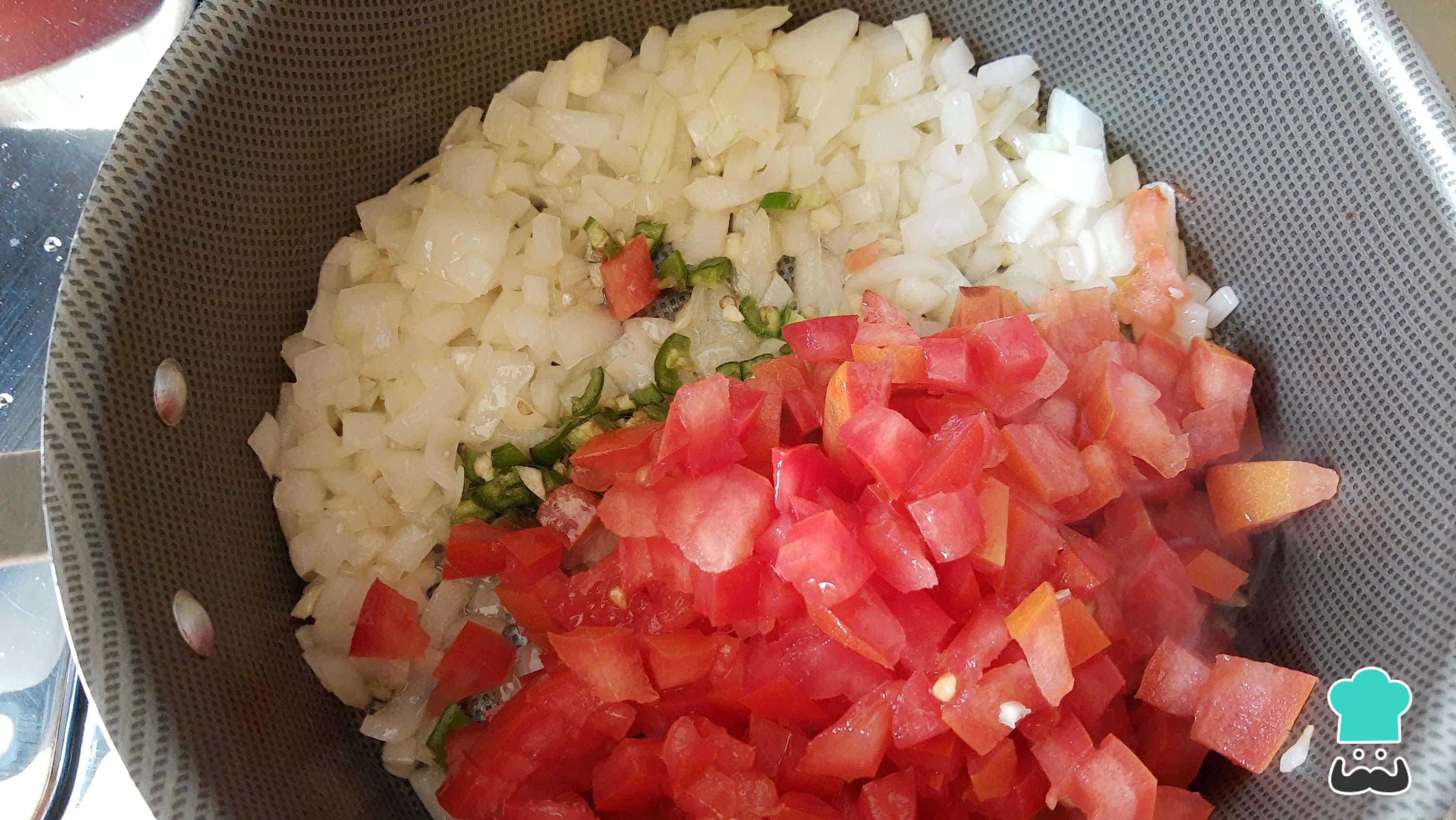 Mientras se sofríen las verduras, pica el camarón en trozos pequeños o medianos. Recuerda que el camarón debe estar limpio sin cáscara.