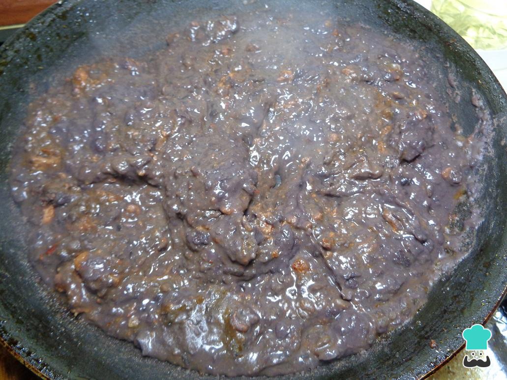 Una vez lista la longaniza, añadimos los frijoles molidos, movemos para integrar estos ingredientes y dejamos que se integren por 4 minutos más. Una vez pasado este tiempo, retiramos del fuego y reservamos para continuar con la preparación de los tacos dorados de queso.