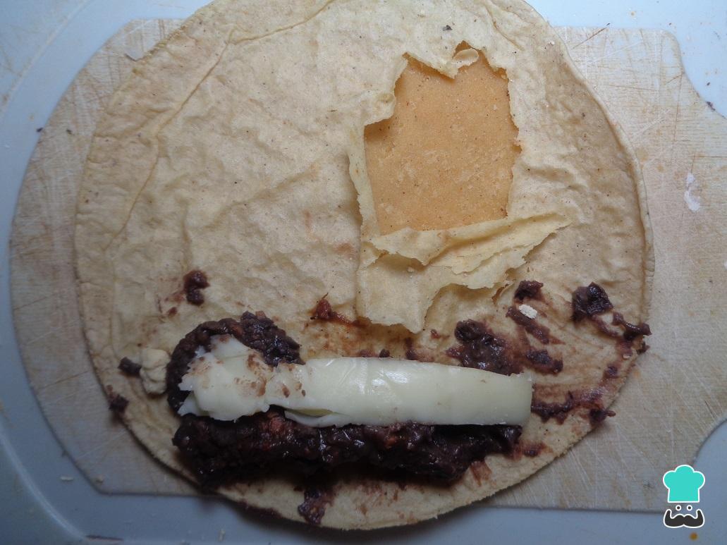 Ahora tomamos una tortilla de maíz y la rellenamos. Para ello, colocamos un poco de frijoles con longaniza en uno de los extremos, agregamos un trozo de queso y comenzamos a enrollar para formar los tacos mexicanos.