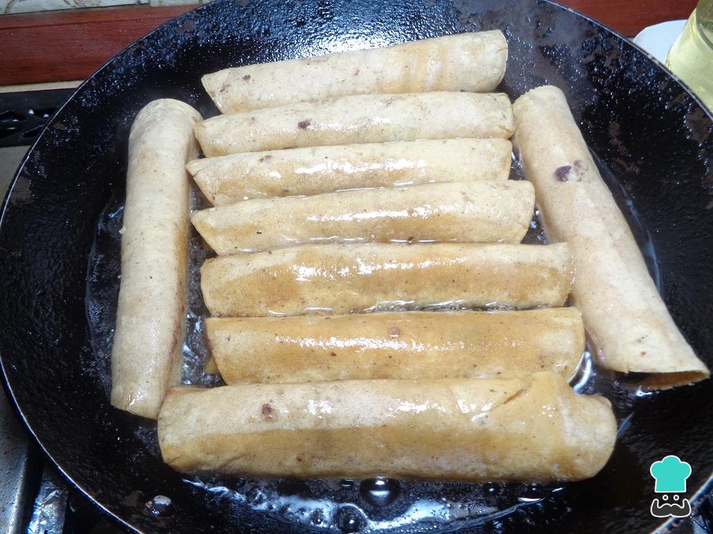 Una vez formados todos los tacos, los llevamos a una sartén con suficiente aceite caliente, los colocamos y dejamos que se frían a fuego alto. Debemos cambiarlos de posición de vez en cuando para procurar que adquieran un dorado uniforme.
