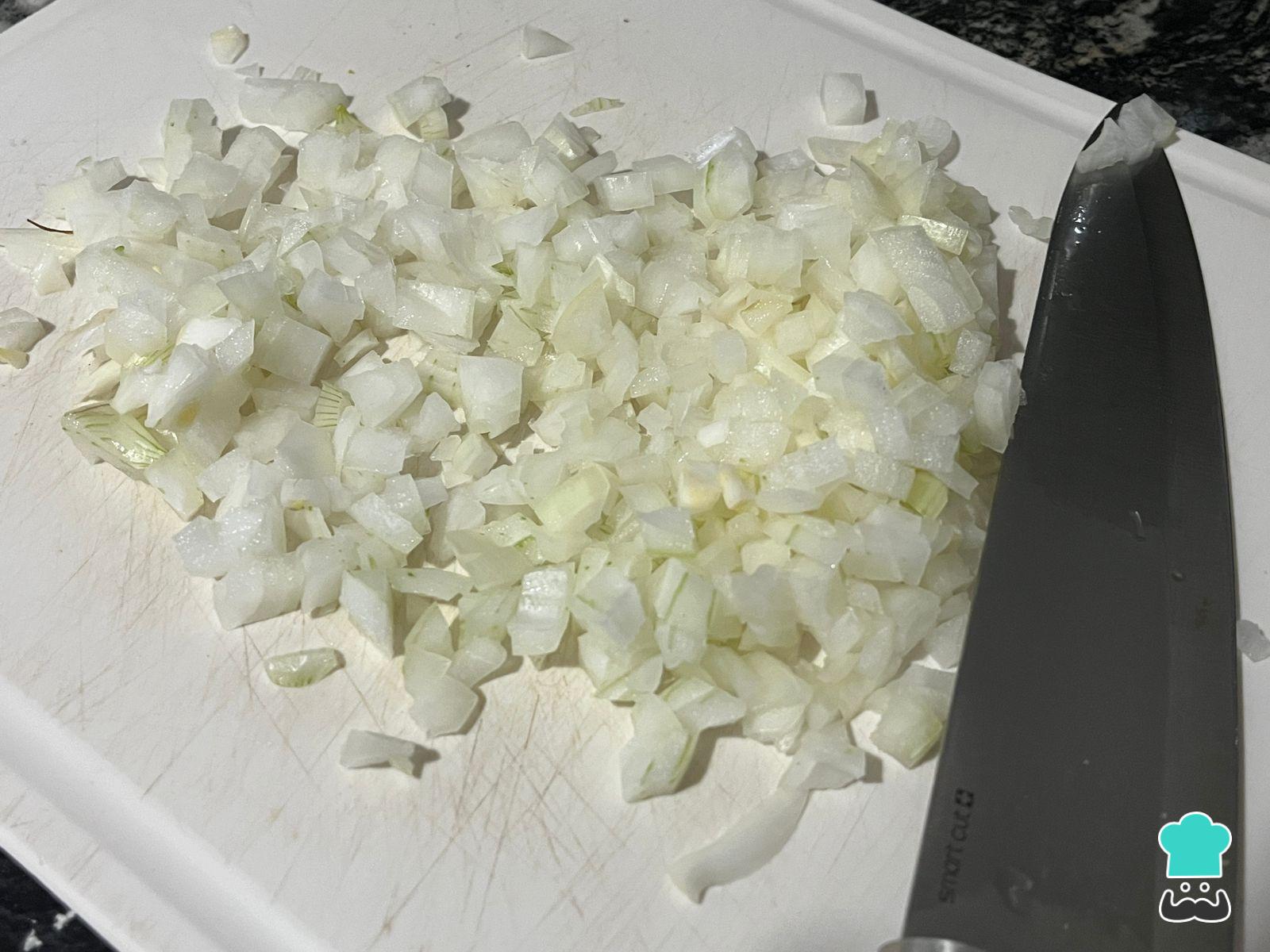 Pela y pica la cebolla para saltearla en una sartén a fuego máximo con 1 cucharadita de aceite. Si el salteado se está secando, baja el fuego a medio y añade 1 cucharada de agua. Repite unas 2 veces más.