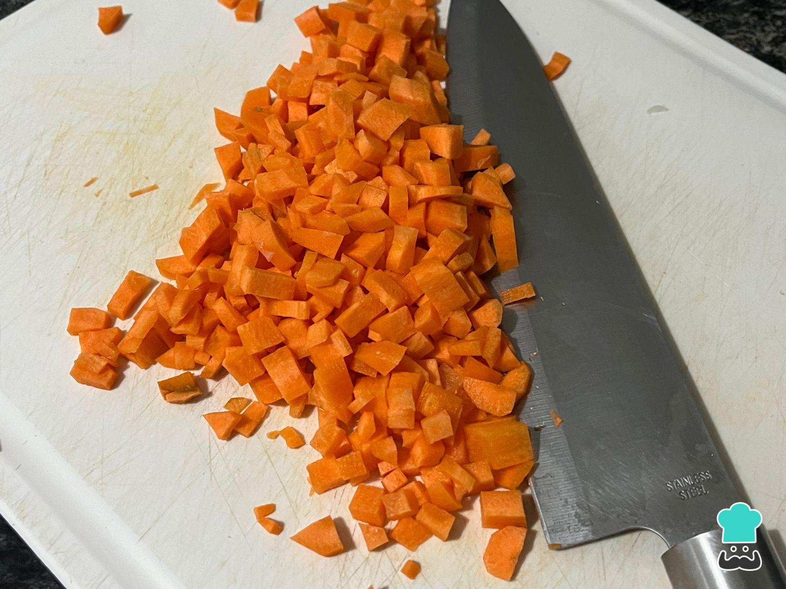 Pela y corta la zanahoria en cubos pequeños. También lava y pica el morrón retirando las nervaduras y semillas. Agrega las verduras al salteado de cebolla y agrega 1 cucharada de agua tantas veces como sea necesario, para que se cocinen y endulcen con sus propios azúcares.
