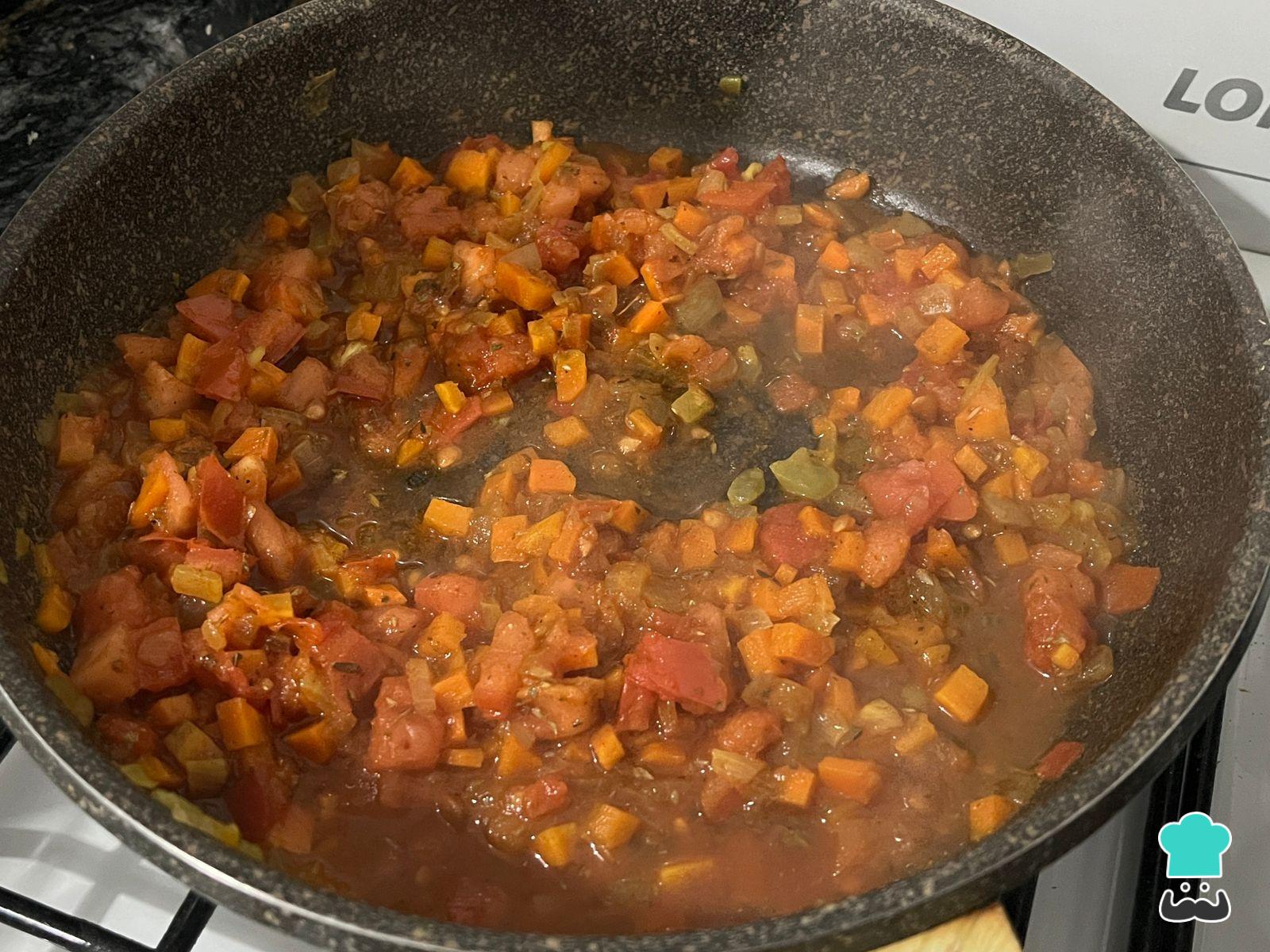 Cuando las veduras estén cocidas, agrega el tomate. Puedes cortarlo al medio y rallarlo, retirar su piel o bien cortarlo en cubos y agregarlo, como prefieras. Mantén el fuego medio hasta que hierva y condimenta a gusto con laurel, tomillo y pimienta, baja a mínimo para cocinar tapado por unos 10 minutos.