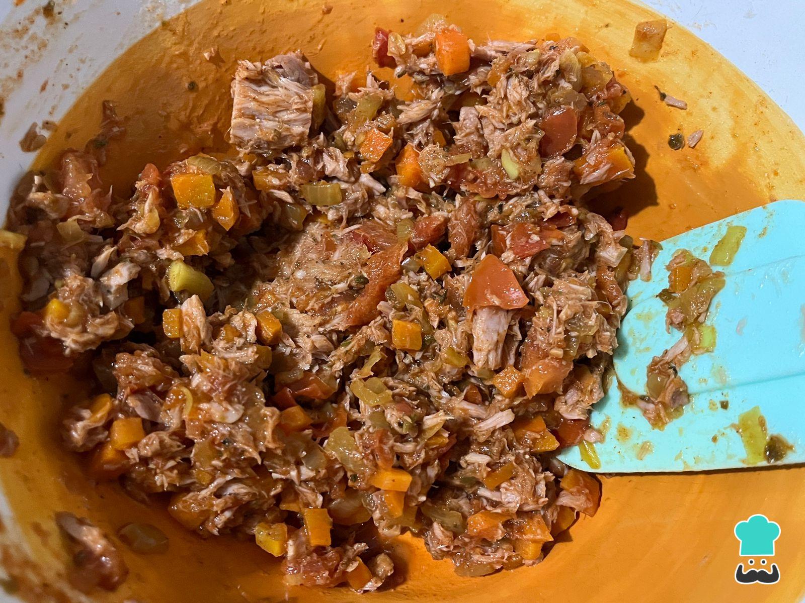Mezcla las verduras salteadas con el atún sin el líquido de la lata y agrega comino. Prueba el relleno de tu tarta de atún y corrige el sabor de ser necesario.