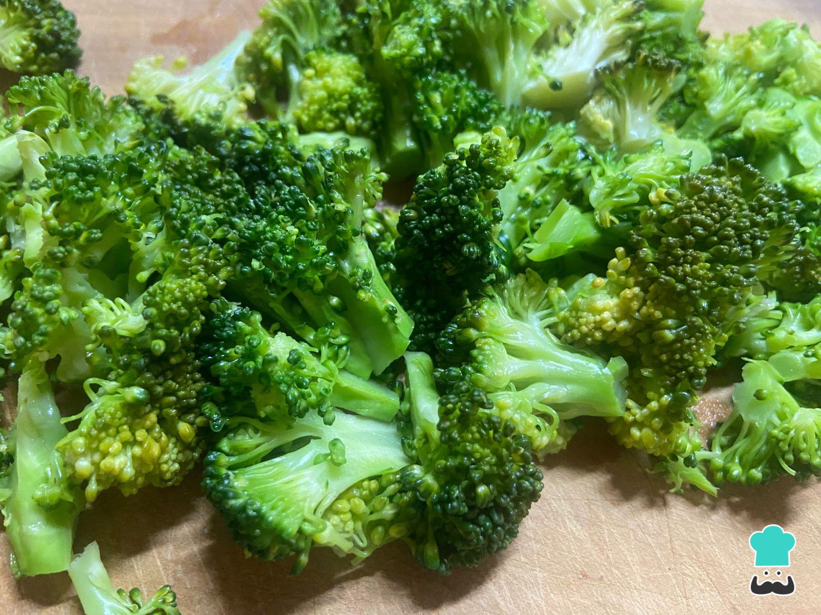 Para comenzar con la elaboración de la tarta, retira las flores de brócoli y hiérvelas en abundante agua durante 5 minutos. Luego, cuela y una vez que se haya enfriado, pica en partes no demasiado chicas para que se noten los “arbolitos”.