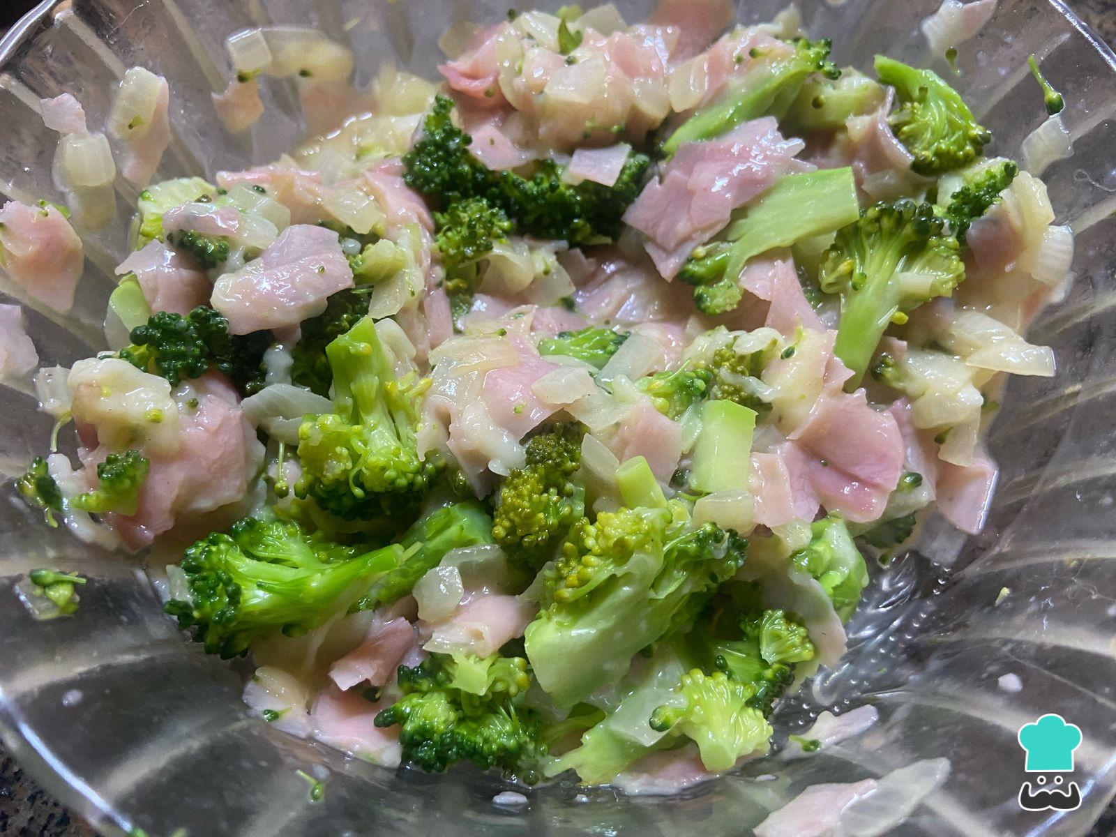 Mientras tanto, bate los huevos en un bol. Añade la cebolla dorada, el jamón, el brócoli picado y la mitad de mozzarella rallada (reserva la otra mitad de la mozzarella)