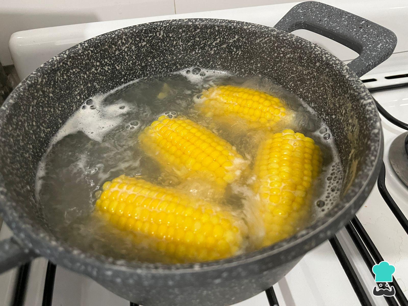 Para empezar con la preparación de la tarta de choclo casera, pela el choclo y cocínalo en abundante agua hirviendo hasta que cambie a un color amarillo brillante, además de fácil de pinchar.