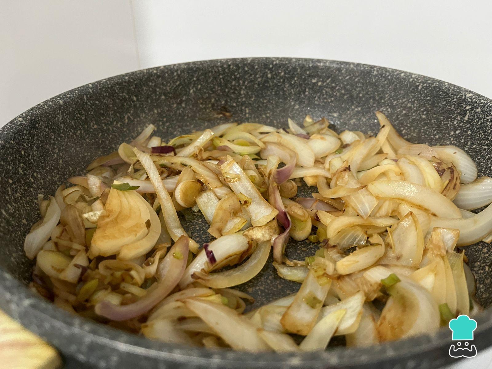 Mientras, pela y corta le cebolla en pluma. Saltéala en la sartén con el fuego máximo y 1 cucharada de aceite. Cuando esté dorada y el salteado empiece a secarse, añade unas cucharadas de agua hirviendo. Repite tantas veces como sea necesario para que se caramelice y combine perfectamente con el sabor dulce del choclo.