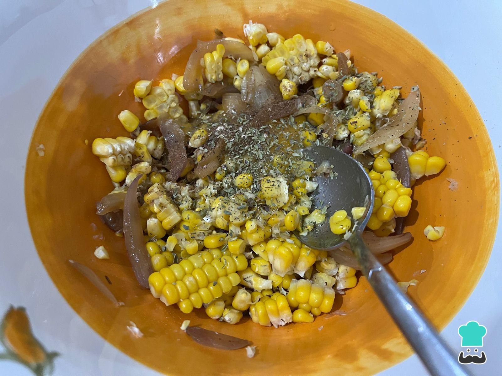 Mezcla el choclo desgranado con la cebolla salteada y condimenta a gusto con el orégano y la nuez moscada. En este caso no utilizamos sal, pero puedes agregarla. Aún así, te animamos a probar otros sabores para reducir el consumo de sodio.