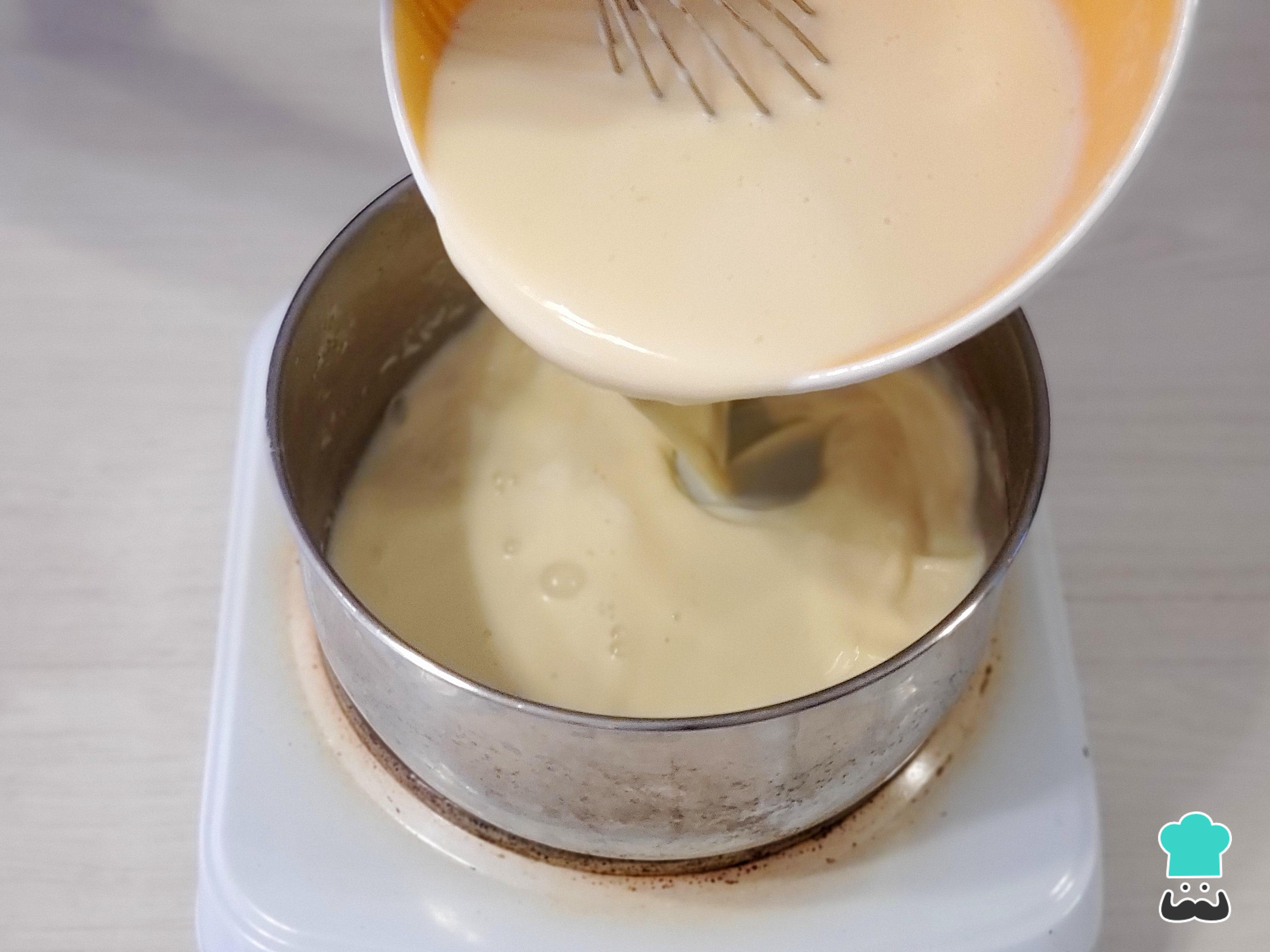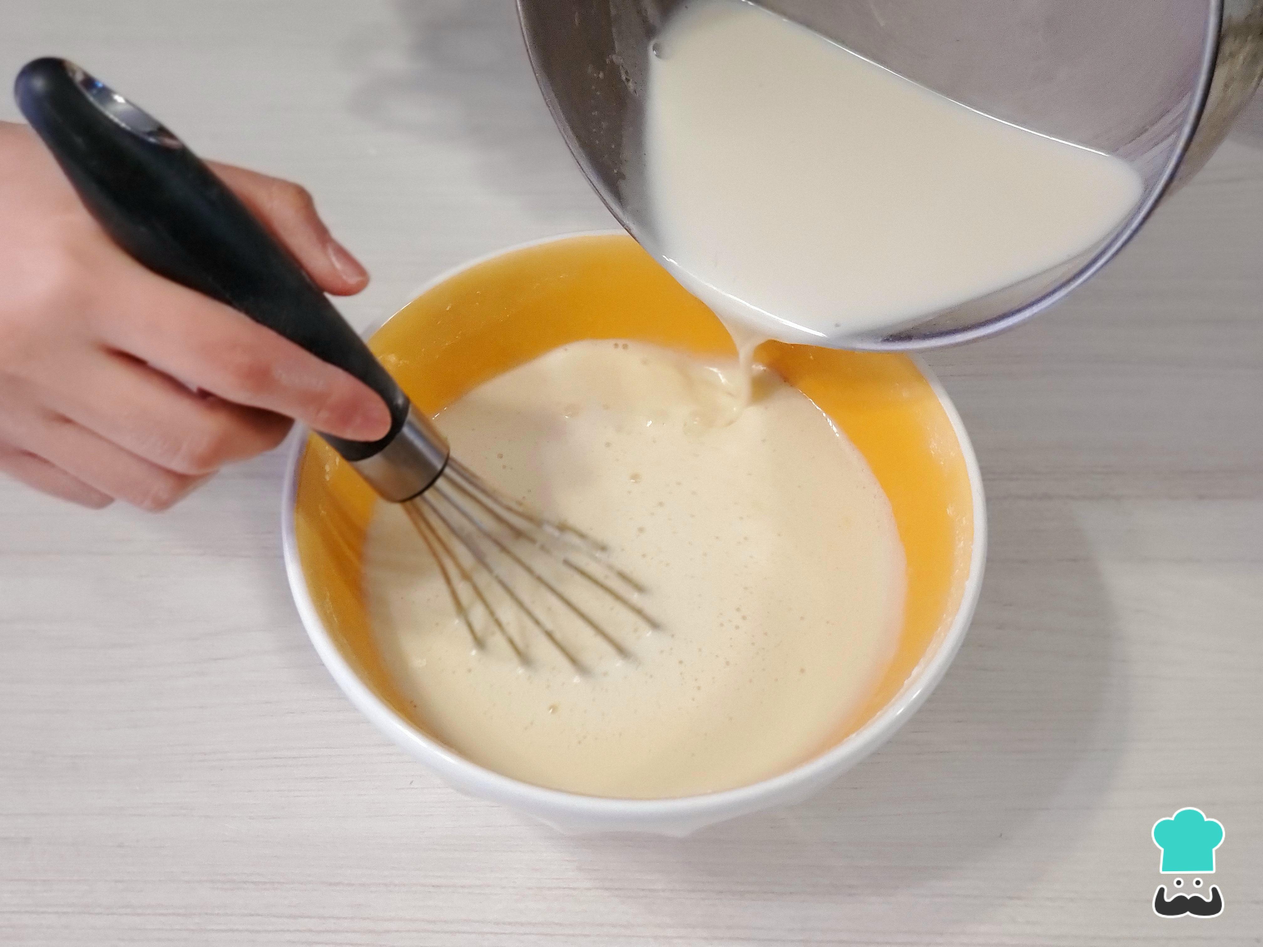 Cuando la leche esté a punto de hervir, viértela poco a poco sobre la mezcla de yemas mientras vas moviendo constantemente con el batidor de globo para evitar que las yemas se coagulen con el calor.
