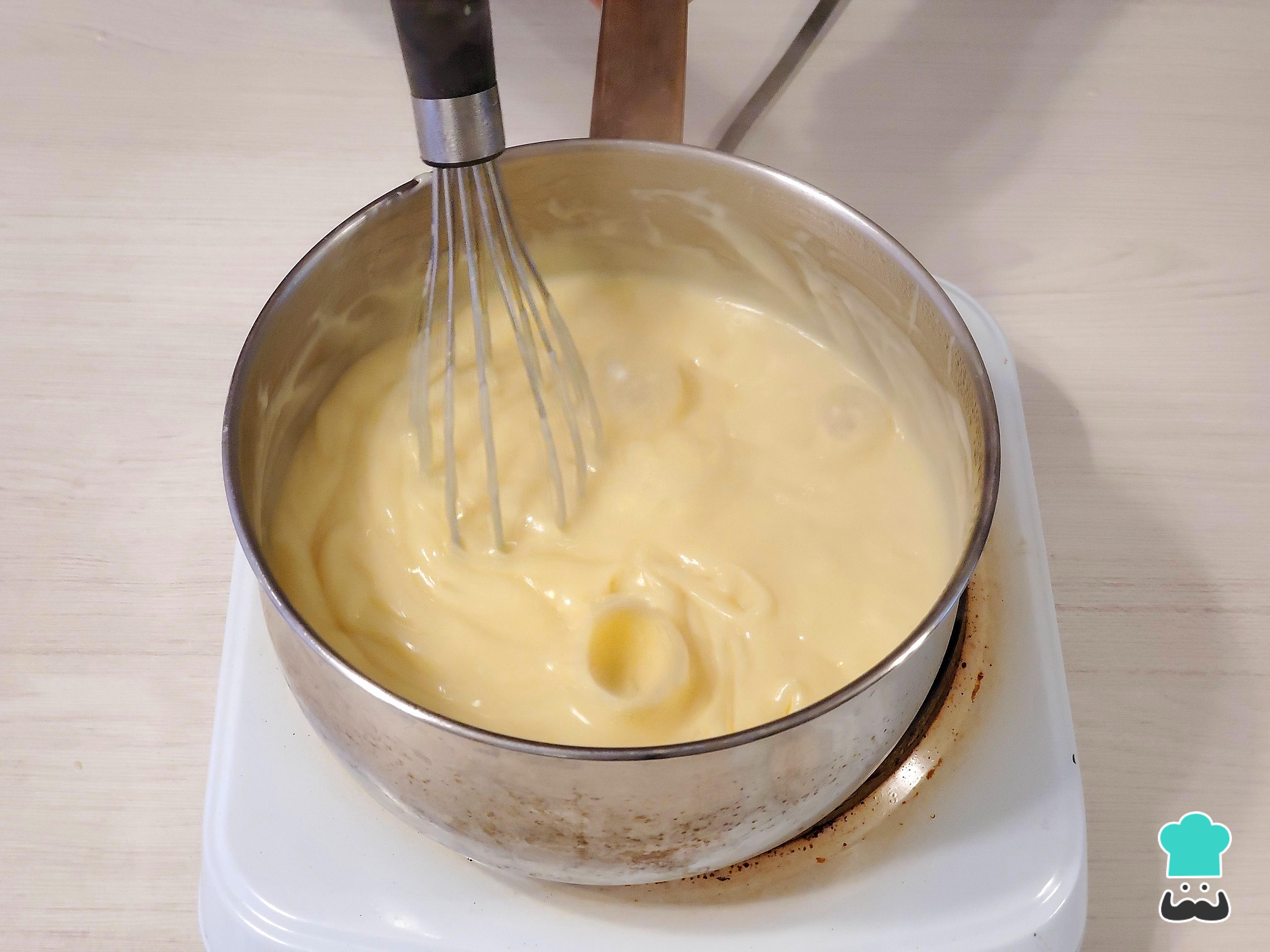 Empieza preparando la crema de vainilla o natillas. En una olla mediana vuelca la leche y aromatiza con un chorrito de esencia de vainilla, canela en rama o cáscara de naranja. Añade al fuego y deja que caliente.