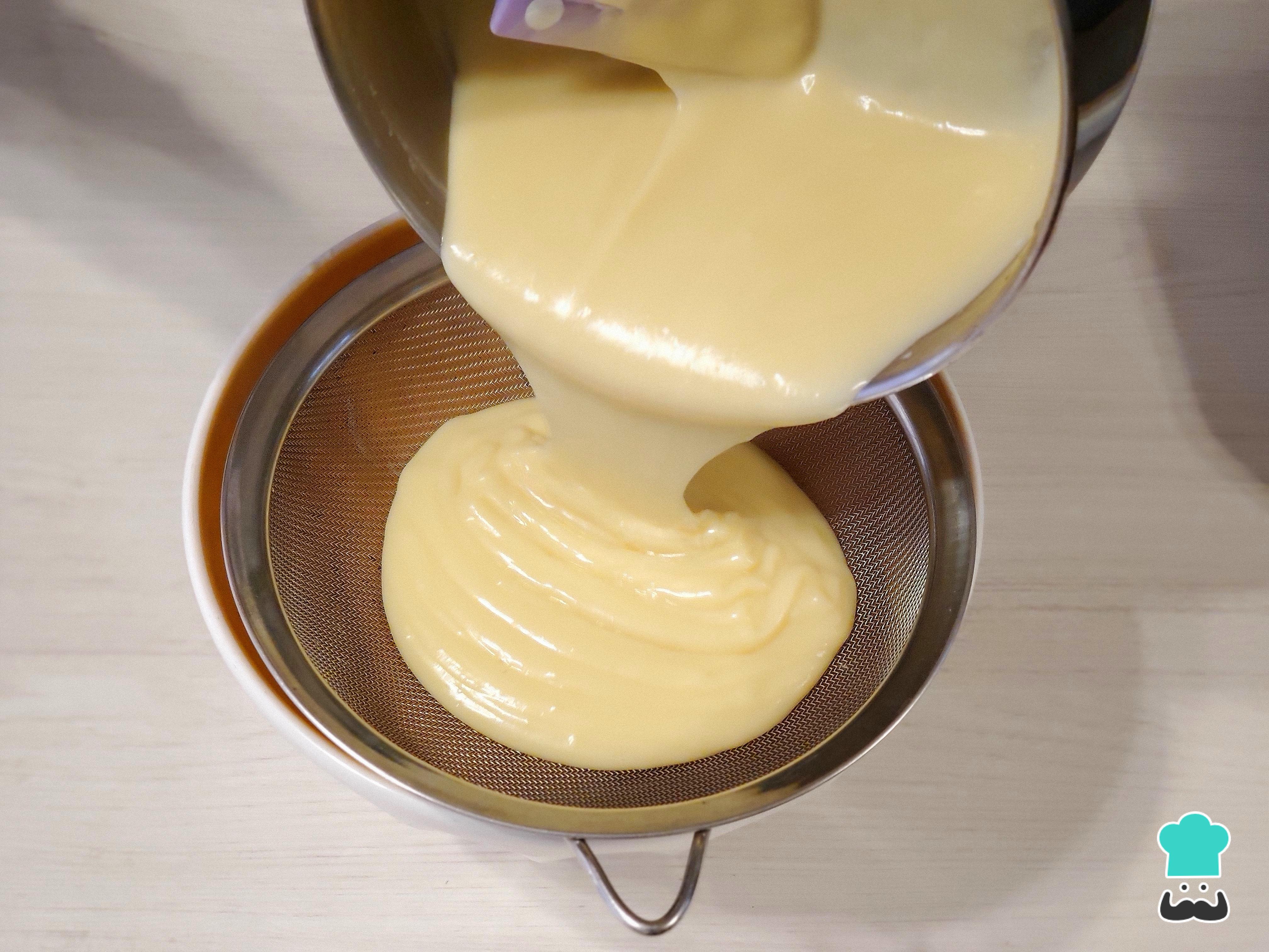 - Cuando termines de colar la crema pastelera, cúbrela con papel film en contacto para evitar que se forme una película densa en la superficie al enfriar.
