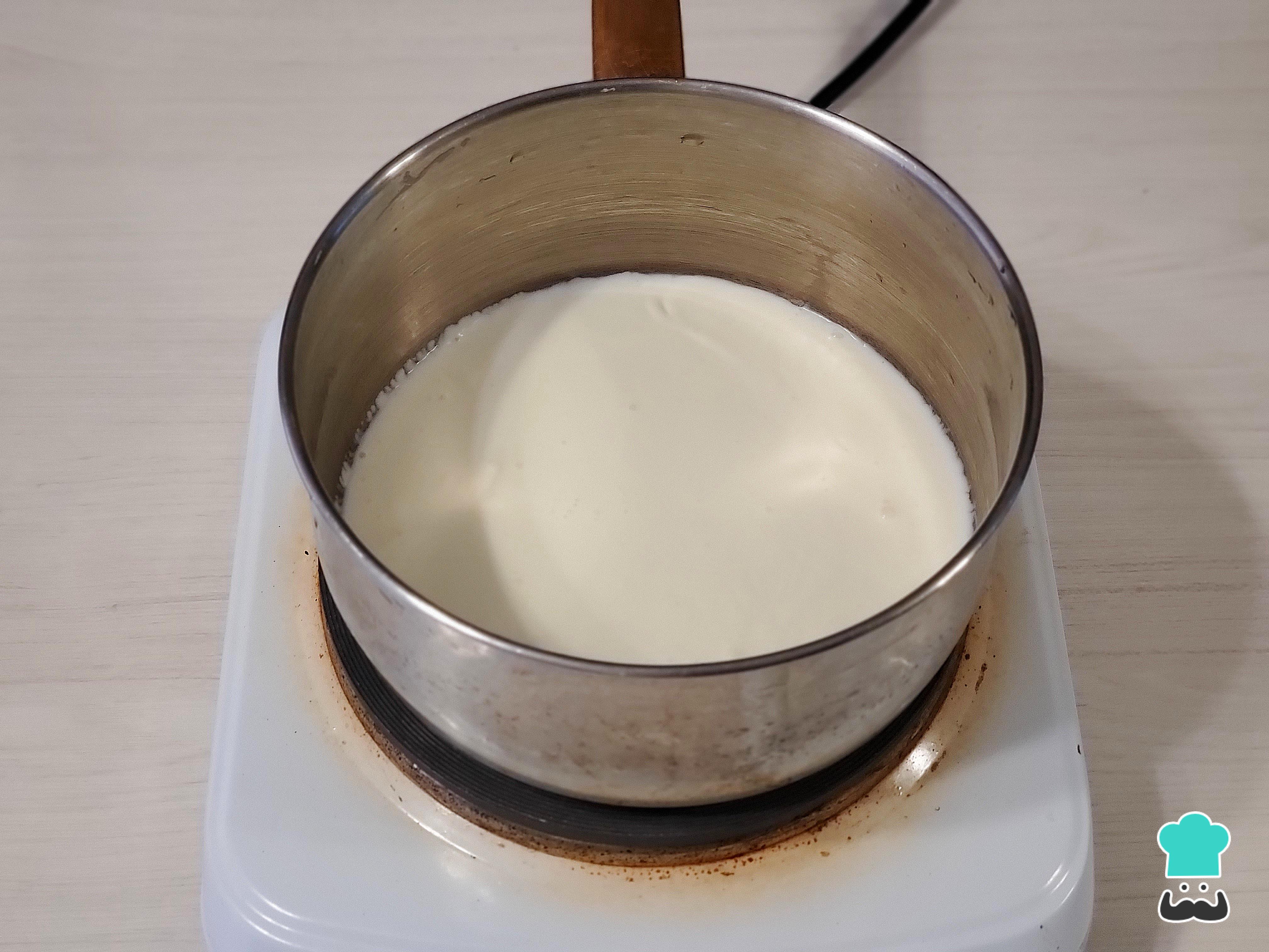 Para finalizar este postre, prepara una ganache de chocolate. Primero calienta la crema de leche hasta que empiece a burbujear.