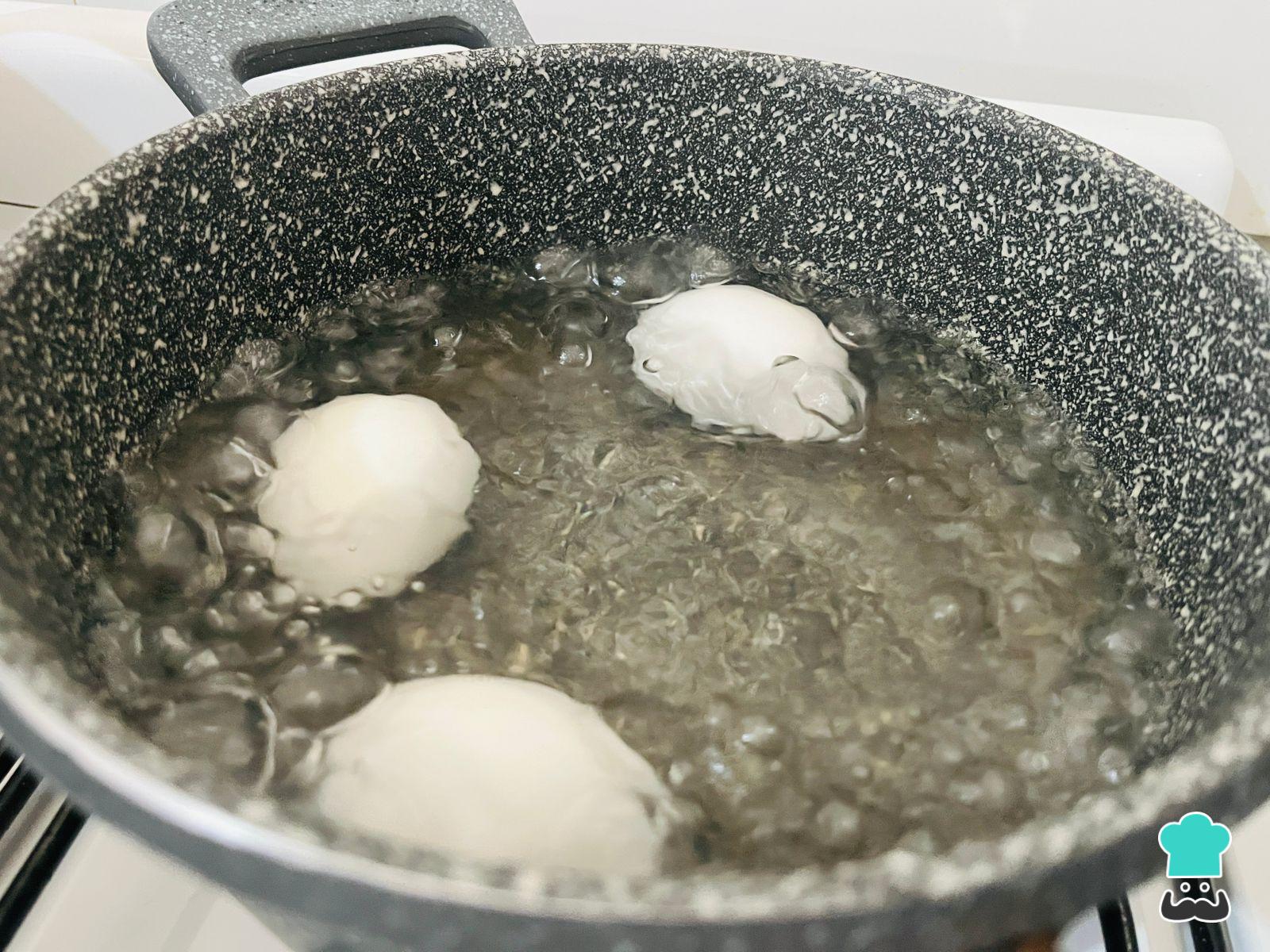 Cocina los huevos desde agua fría por 12 minutos. Retíralos, resérvalos unos minutos en agua fría para no quemarte, pélalos y resérvalos.