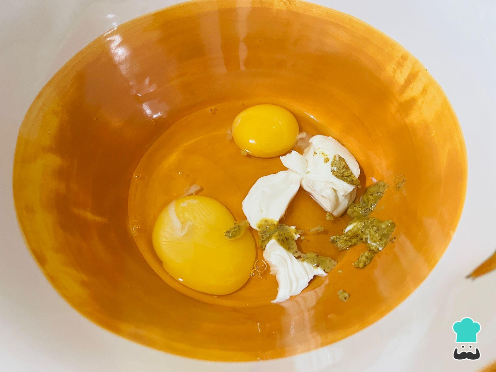 Por otro lado, mezcla los huevos con el queso y la mostaza. Puedes condimentar tu tarta con nuez moscada, orégano, tomillo, perejil, albahaca o crema.