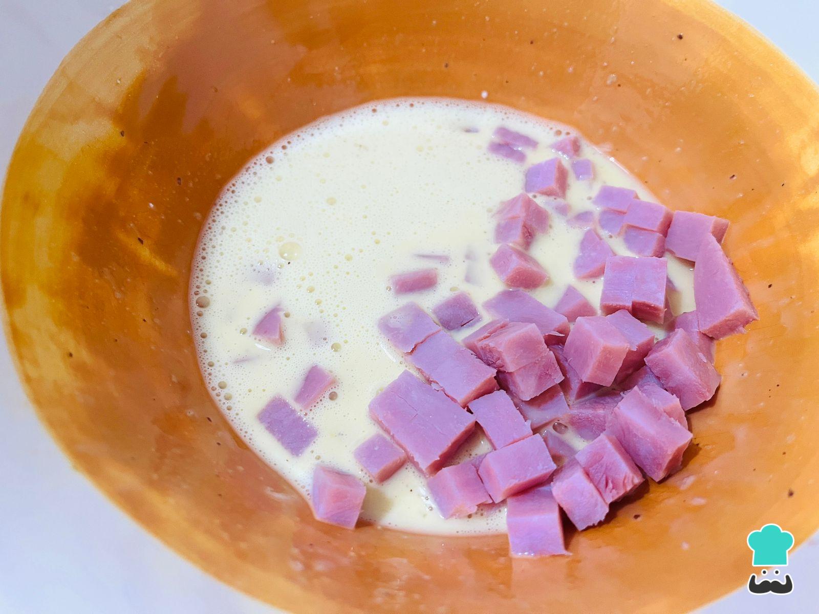 Bate el ligue de tu tarta y agrega allí el jamón cortado en cubos.