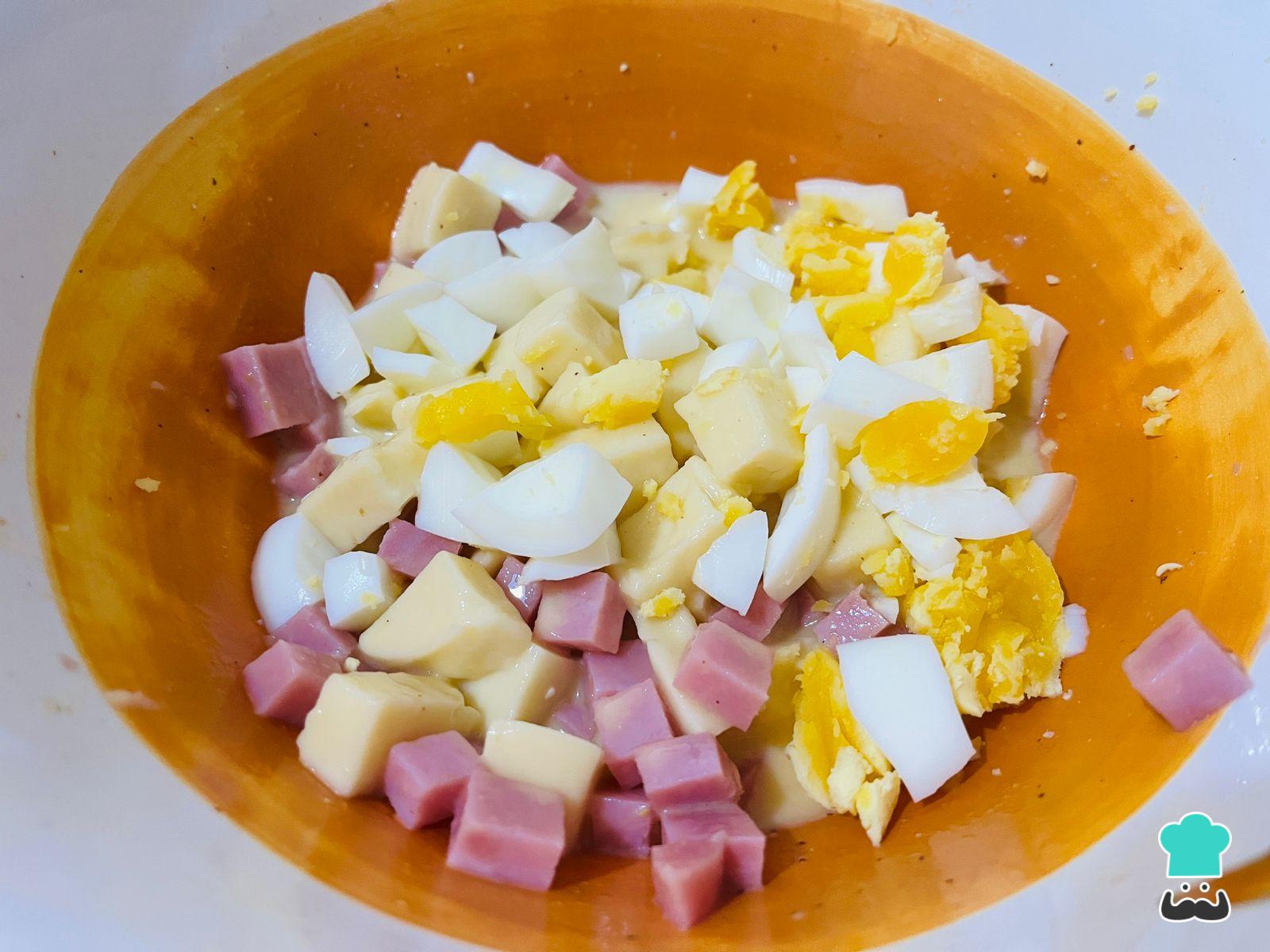 Agrega también la mozzarella cortada en cubos y los huevos previamente cocidos, también cortados en cubos.