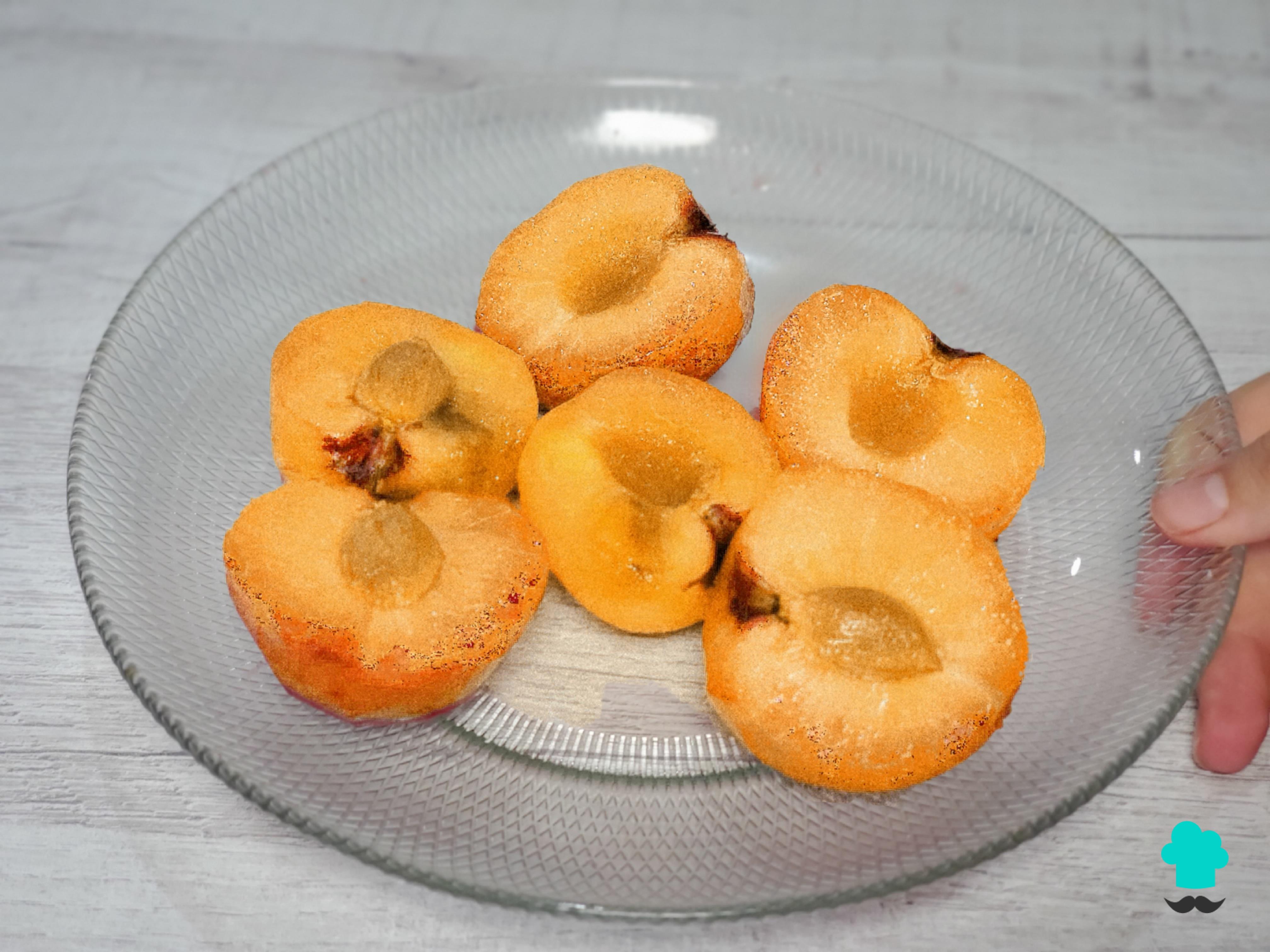 Corta los nísperos por la mitad, gíralos suavemente para separar las mitades. Seguidamente, retira la cáscara y las semillas, y resérvalos.