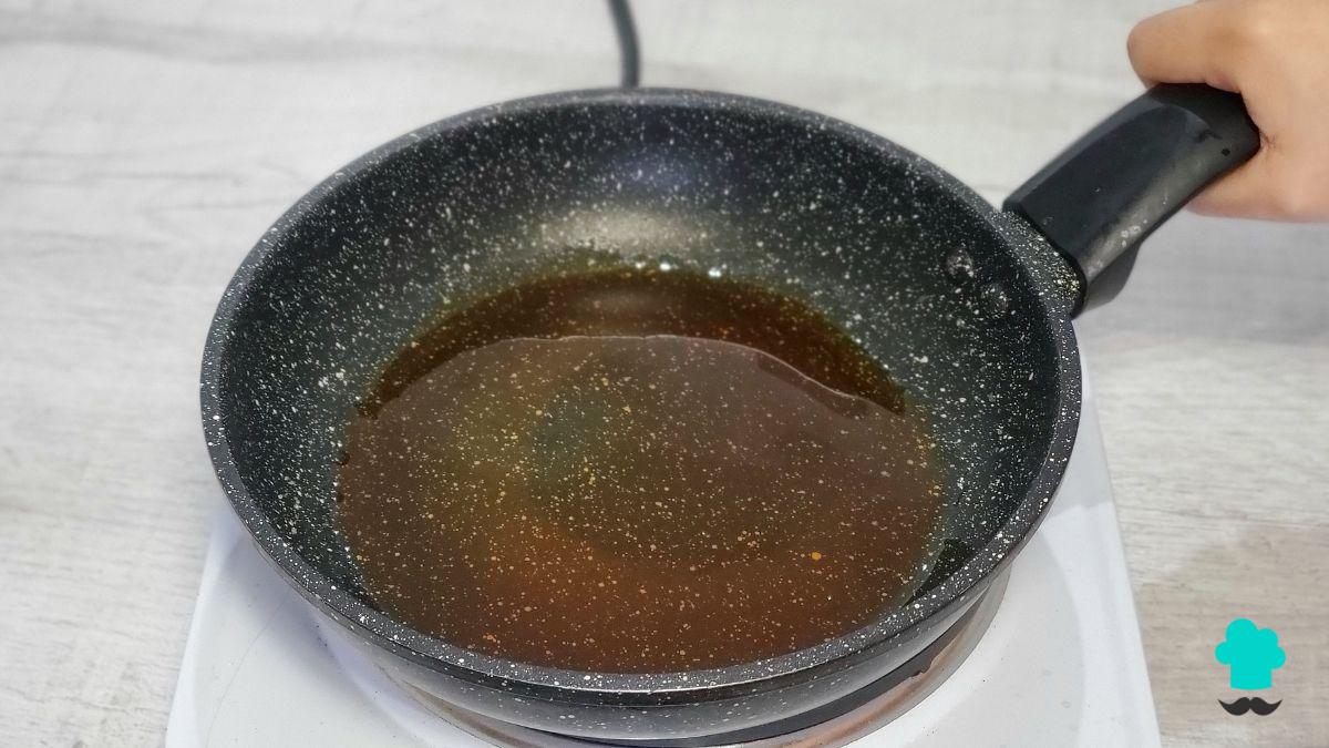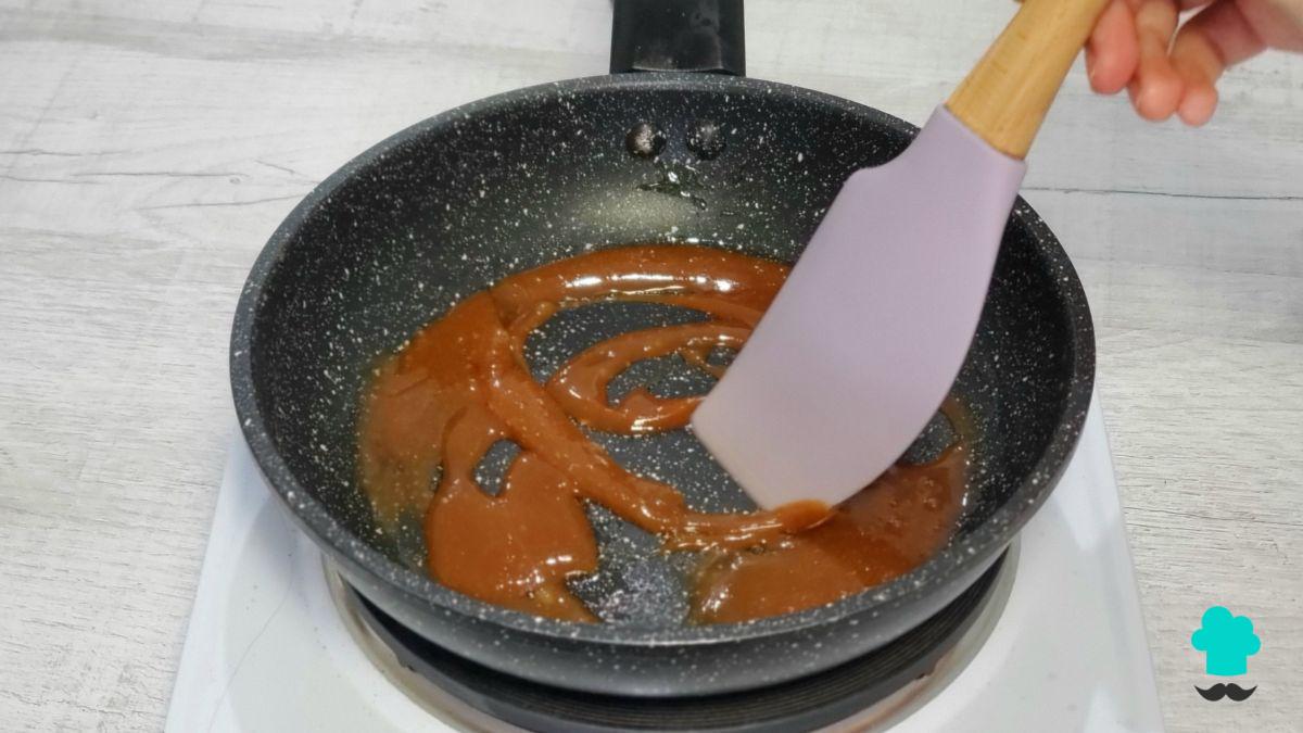 Tras unos minutos el azúcar se habrá fundido por completo y tomará un tono ligeramente dorado. Entonces mantén la sartén a fuego bajo y deja que alcance más temperatura para un color dorado más intenso. Ten cuidado de que no se queme; para evitarlo, remueve con un cucharón o una espátula lentamente.