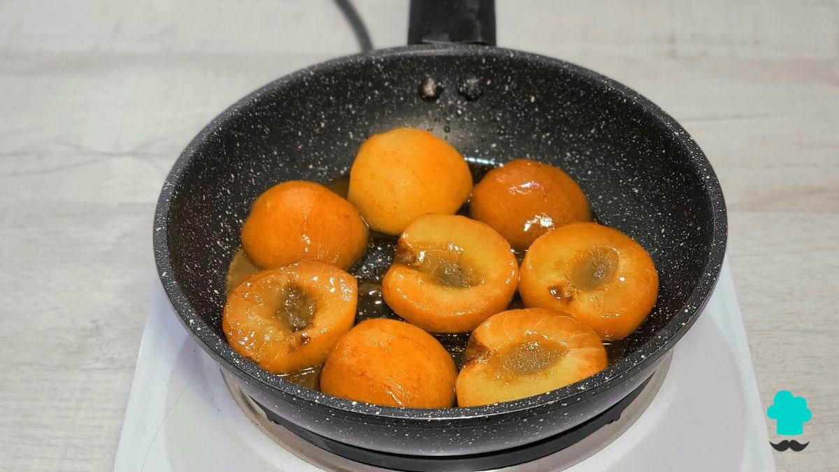 Primero prepara el caramelo, que además de endulzar resaltará la ligera acidez natural de la fruta y le dará un color dorado muy apetecible. Luego, coloca las mitades de níspero sin semillas ni cáscara, con la parte plana apoyada sobre el caramelo. Si prefieres, puedes intercalar algunas mitades en distintas posiciones para crear un diseño más dinámico y atractivo.