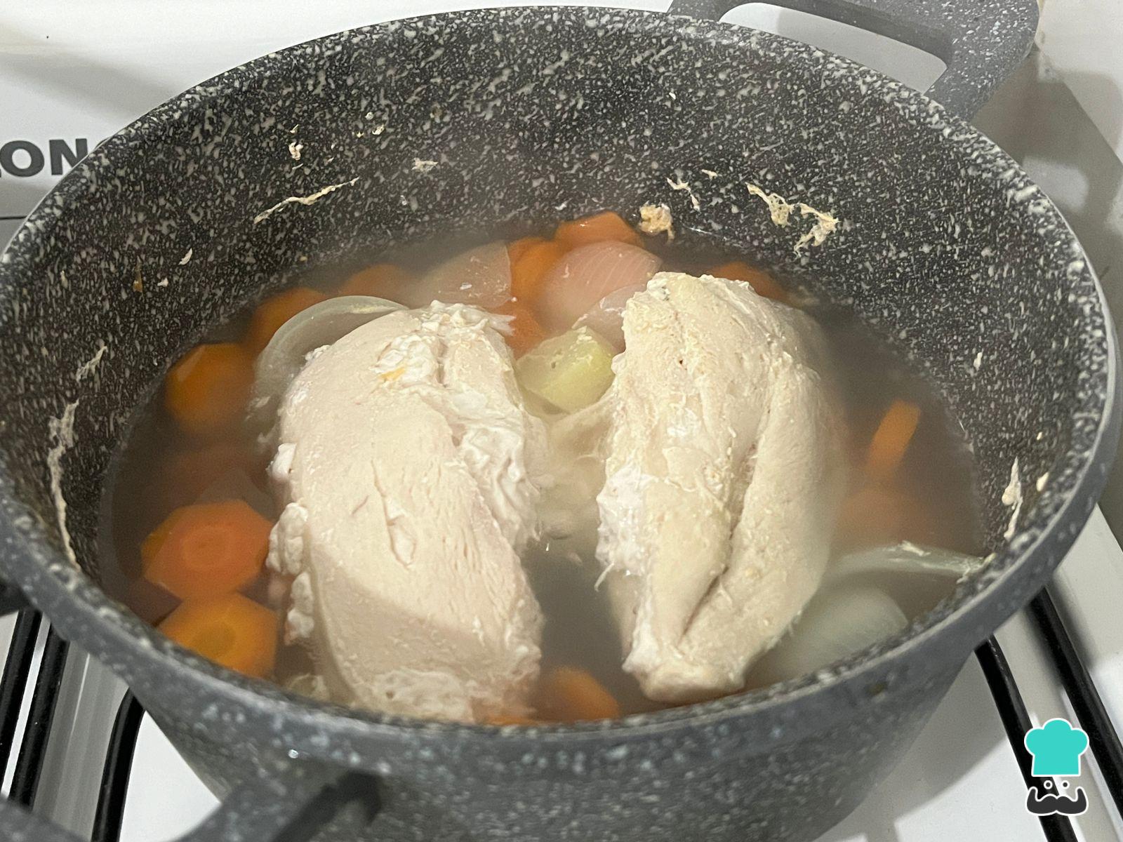Cocina el pollo por aproximadamente 1 hora en abundante agua con las verduras y condimentos que más te gusten para proporcionar sabor. Recomendamos combinar las más suaves como zanahoria, calabaza con algunas más intensas y sabrosas como apio, puerro y/o cebolla. También desaconsejamos el uso de caldos industrializados.