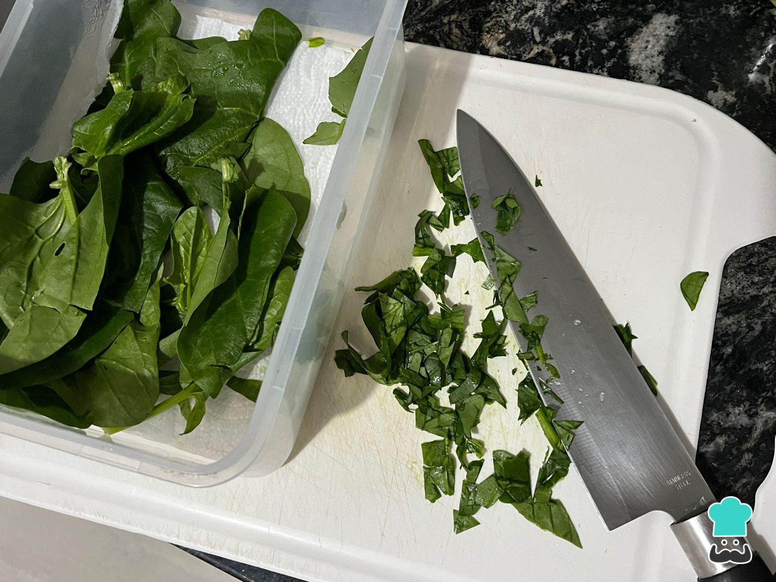 Pica la espinaca cruda para que se amalgame bien con el resto de los ingredientes de esta tarta. Para sanitizarla correctamente, déjala unos 15 minutos en remojo en una solución de 1 gota de lavandina apta para alimentos por litro de agua.