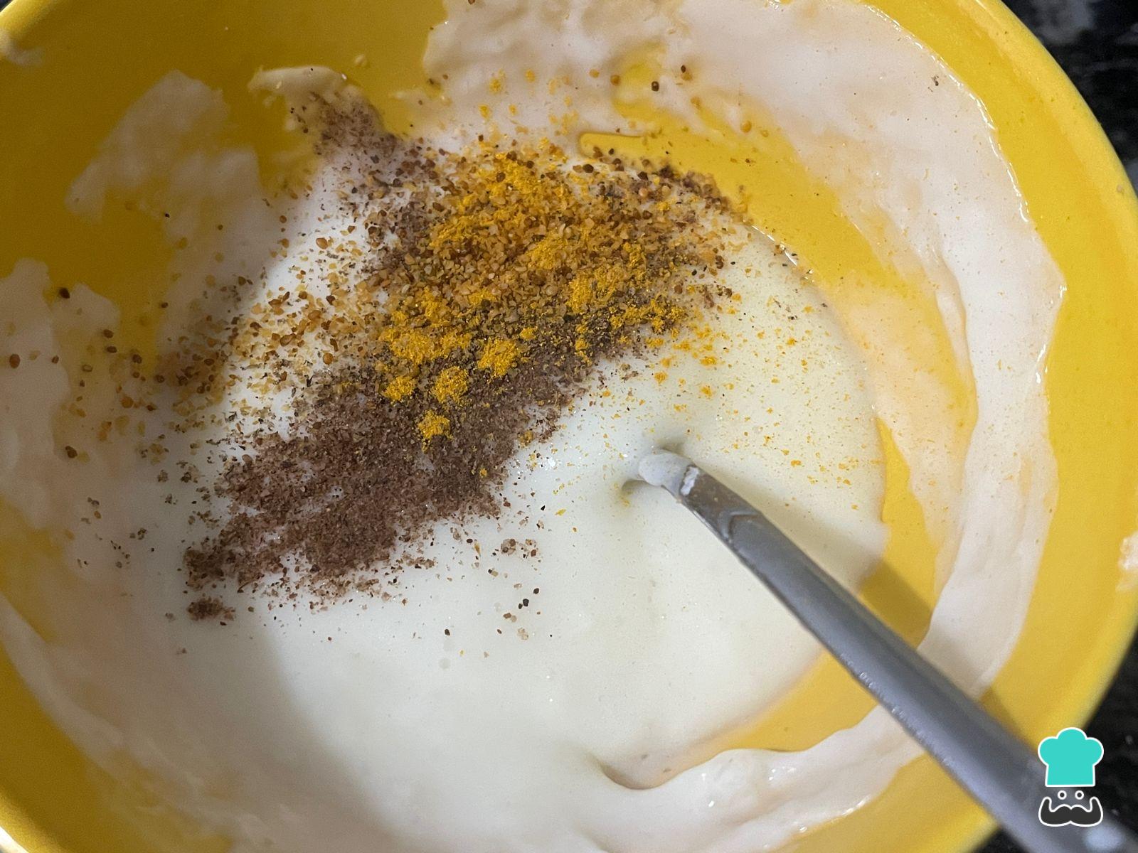 Mezcla la leche fría con el almidón de maíz o maicena. Caliéntala en el microondas de a 30 segundos o en una olla a fuego mínimo, revolviendo hasta que espese. Condimenta a gusto con mostaza en polvo, nuez moscada, pimienta o los condimentos que más te gusten.