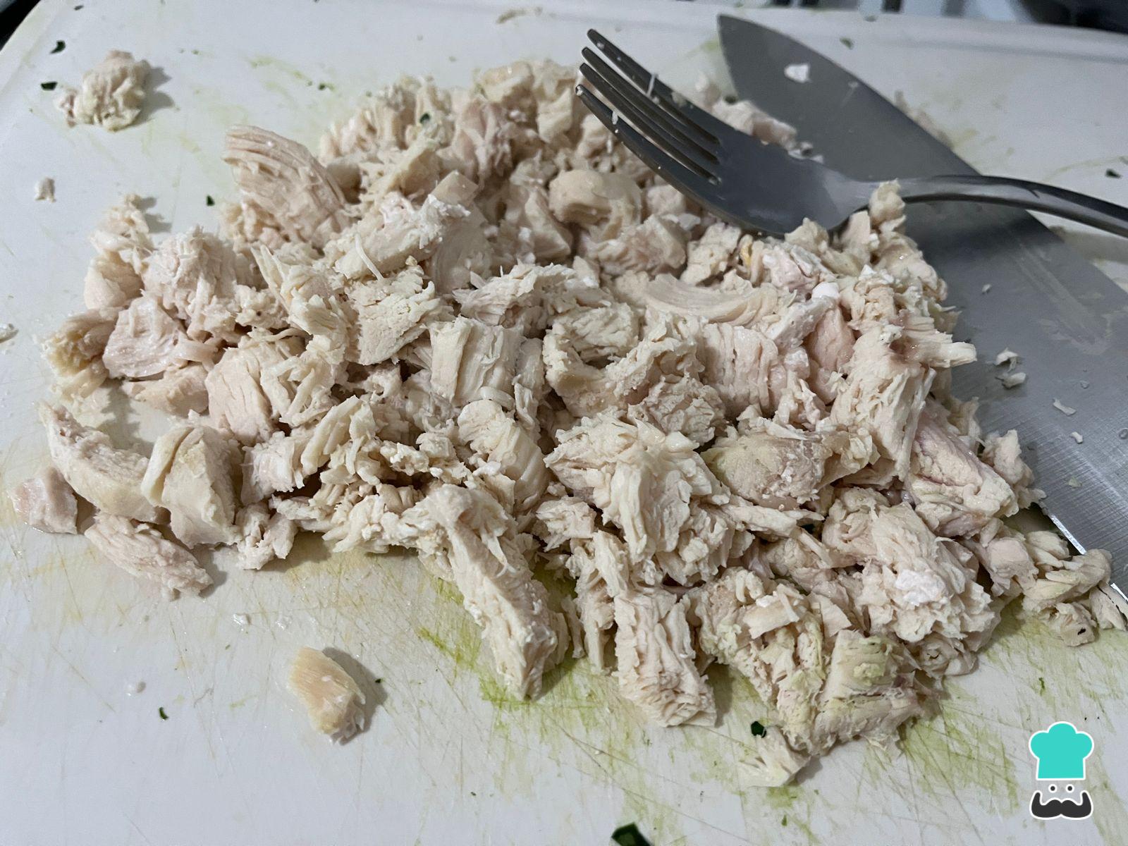 Pasado el tiempo de cocción del pollo, ayúdate con dos tenedores o una cuchilla para desmenuzarlo. No te preocupes si no está del todo cocido, ya que terminará de cocinarse en el horno.