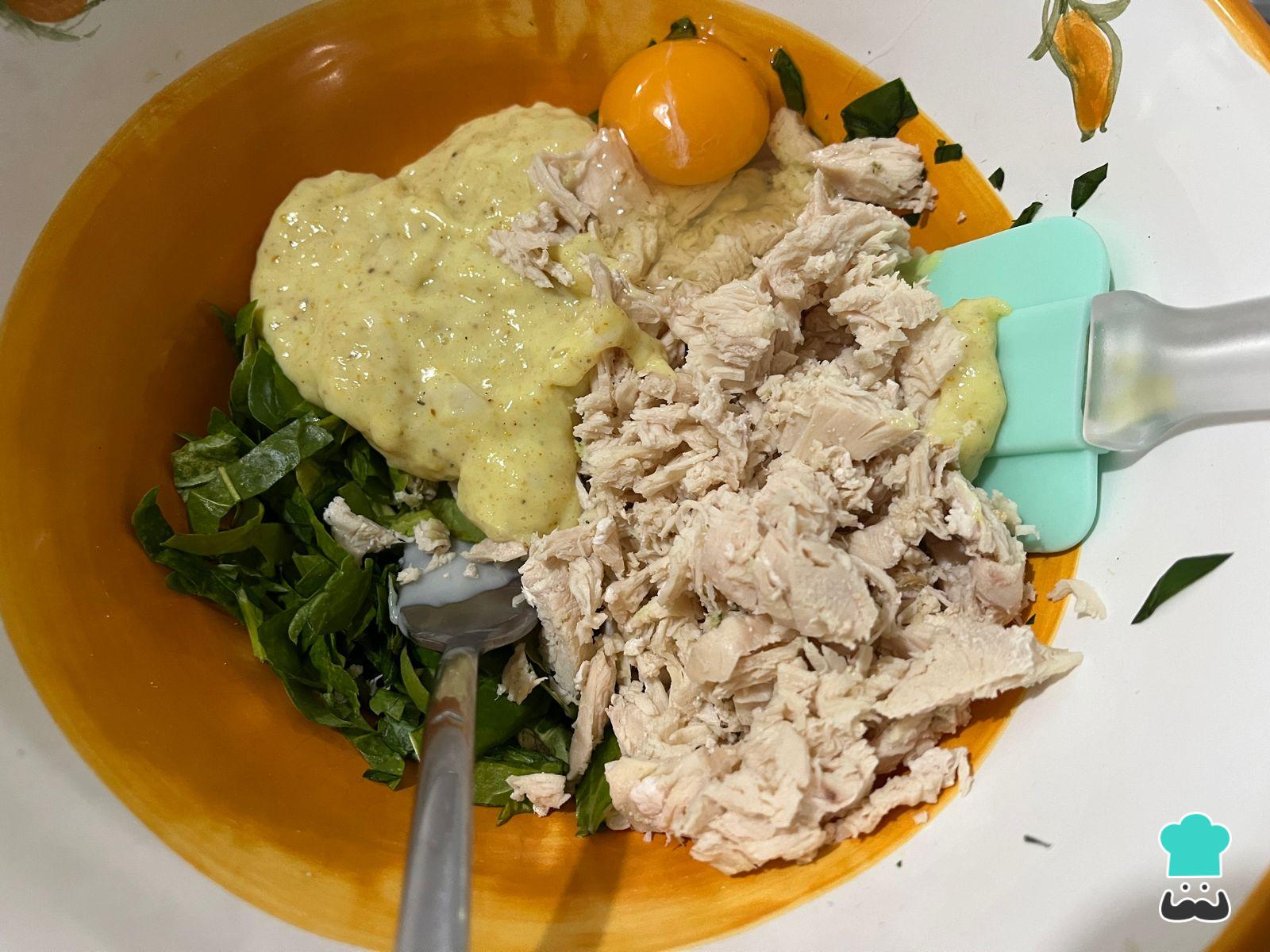 Integra todos los ingredientes del relleno de tu tarta de pollo y espinaca, es decir, el pollo desmenuzado, la espinaca picada, la salsa blanca condimentada y el huevo.