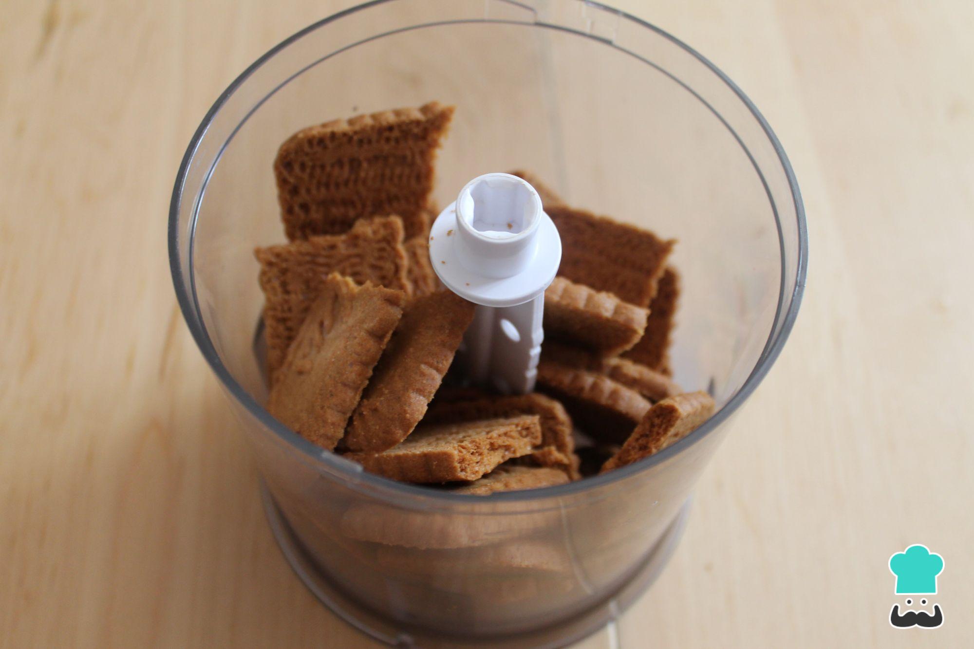 En primer lugar prepara la base de la tarta de galletas Lotus. Tritura las galletas Lotus en un robot de cocina hasta convertirlas en polvo.