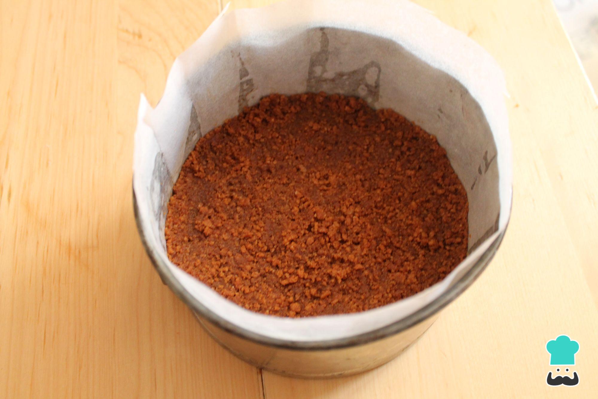 Derrite la mantequilla troceada en el microondas y, una vez fundida, viértela sobre las migas de galletas Lotus, mezclando hasta obtener una masa compacta. Forra con papel de horno un molde redondo desmontable de unos 20 cm de diámetro y reparte la mezcla en el fondo, presionando bien con una cuchara o con las manos para nivelarla. Reserva en la nevera.