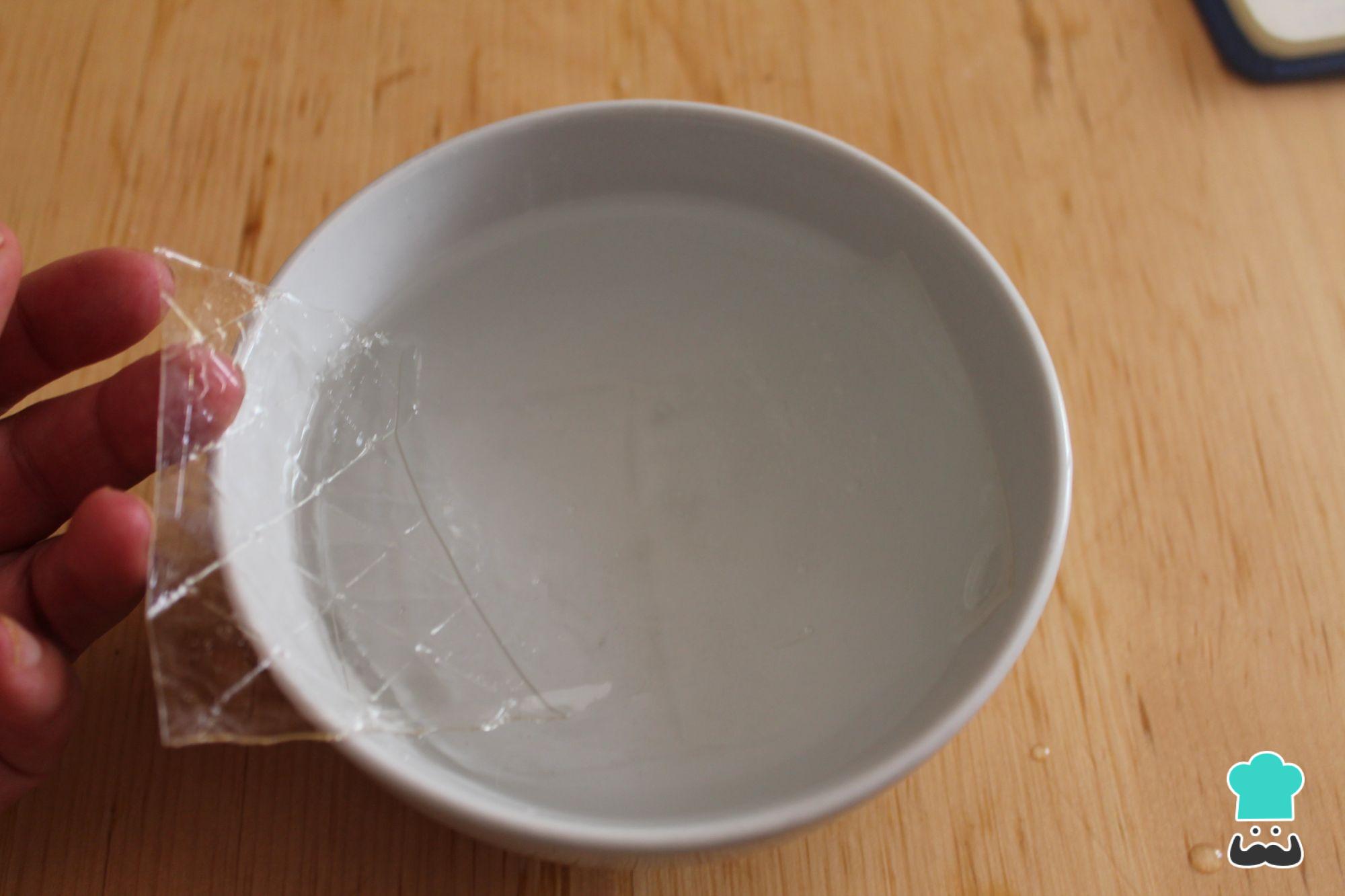 Prepara el relleno. Añade las hojas de gelatina en agua para que se hidraten.