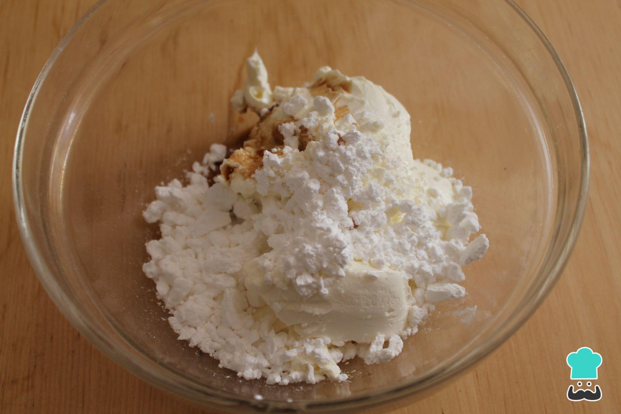 Coloca en un bol el queso crema junto con el azúcar glas y la cuchada de postre de vainilla líquida. Mezcla bien hasta que los tres ingredientes queden bien integrados.