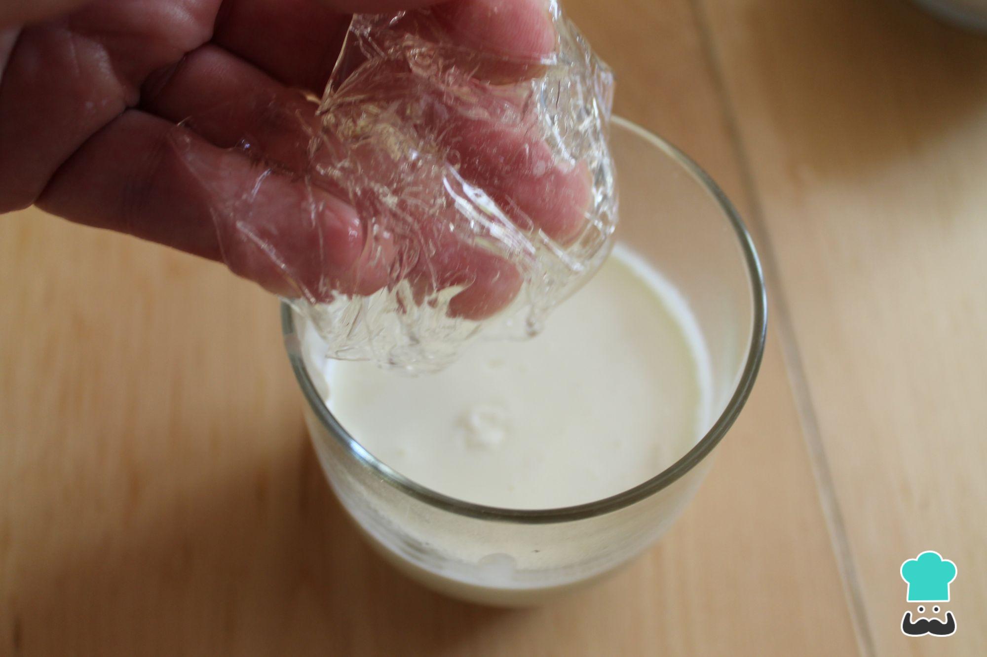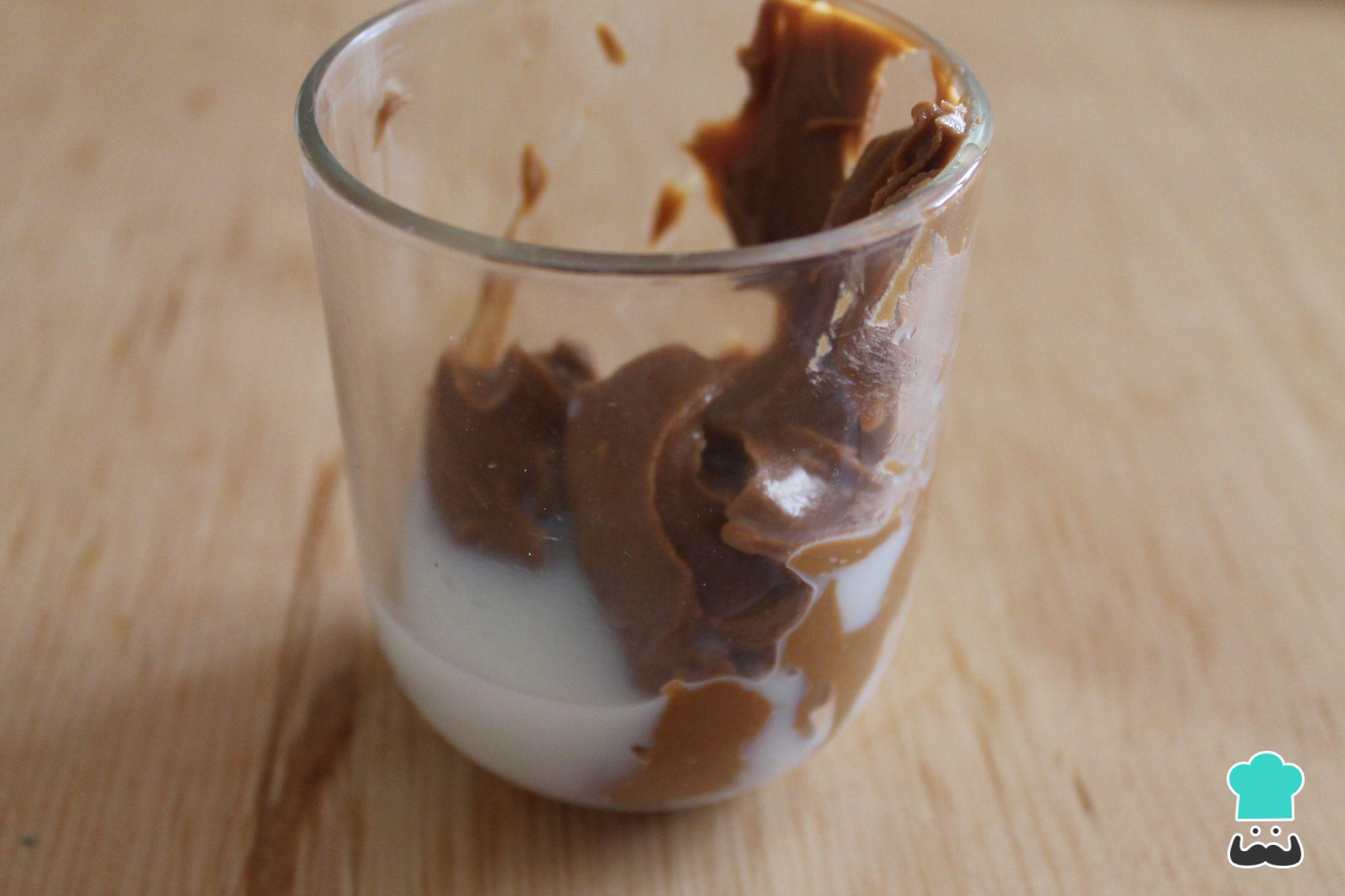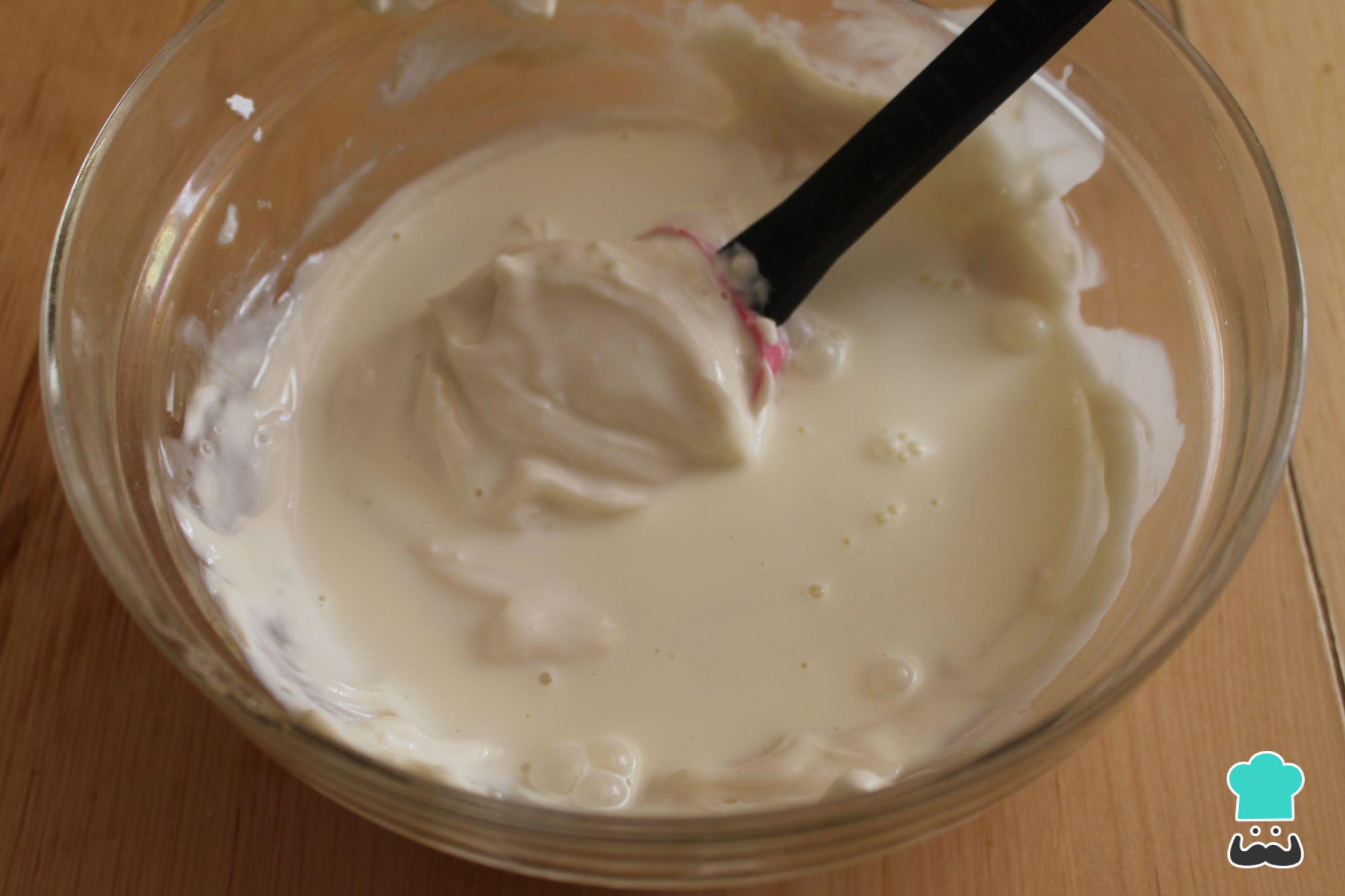 Calienta la mitad de la nata para montar en el microondas y escurre las hojas de gelatina, también añade la leche caliente. Bate bien para que la gelatina quede bien integrada.