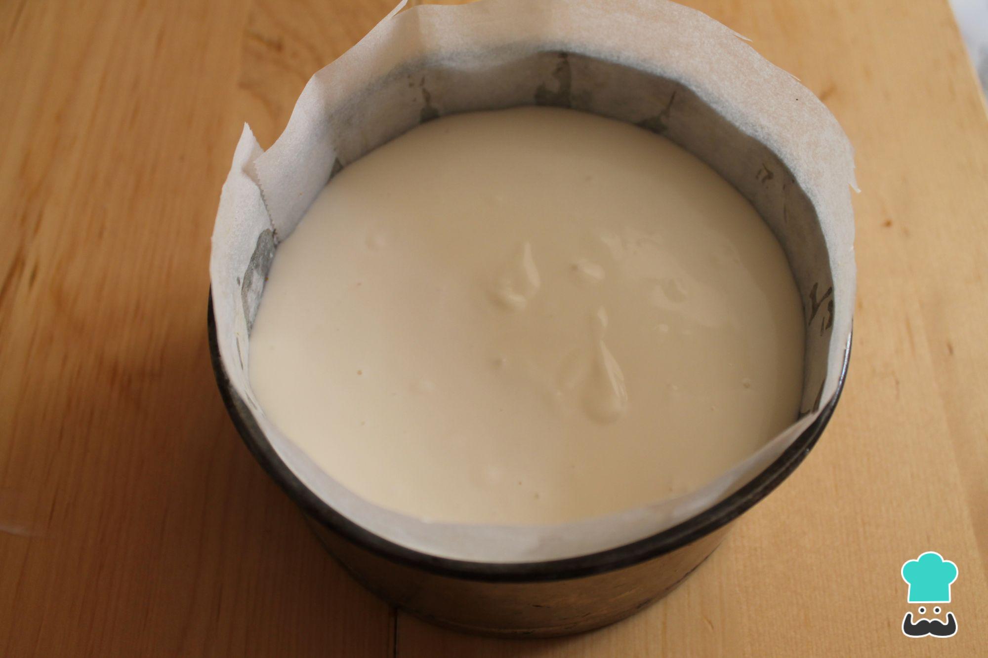 Vierte el relleno de queso en el molde con la base de galletas y deja enfriar en la nevera al menos 4 horas o de un día para otro.