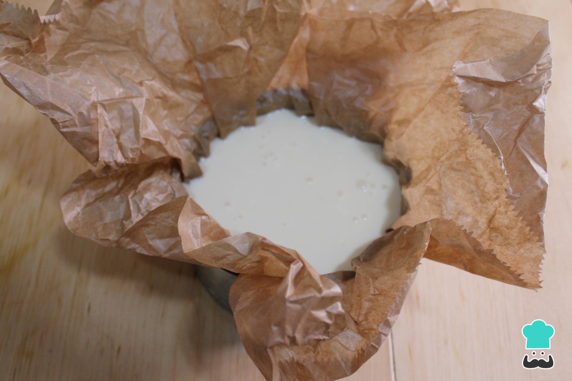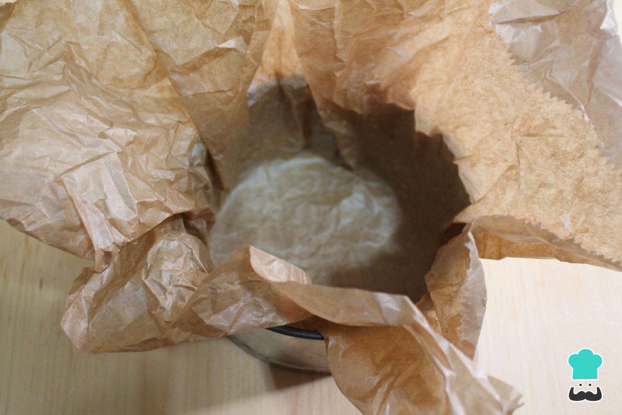 Precalienta el horno a 200º C y arruga un papel de horno con las manos, estíralo y forra con él un molde redondo de unos 14 cm de diámetro. Puedes recortar el exceso de papel o dejarlo hasta que esté horneada, pues a veces la masa sube hacia arriba y es mejor que sobre papel.