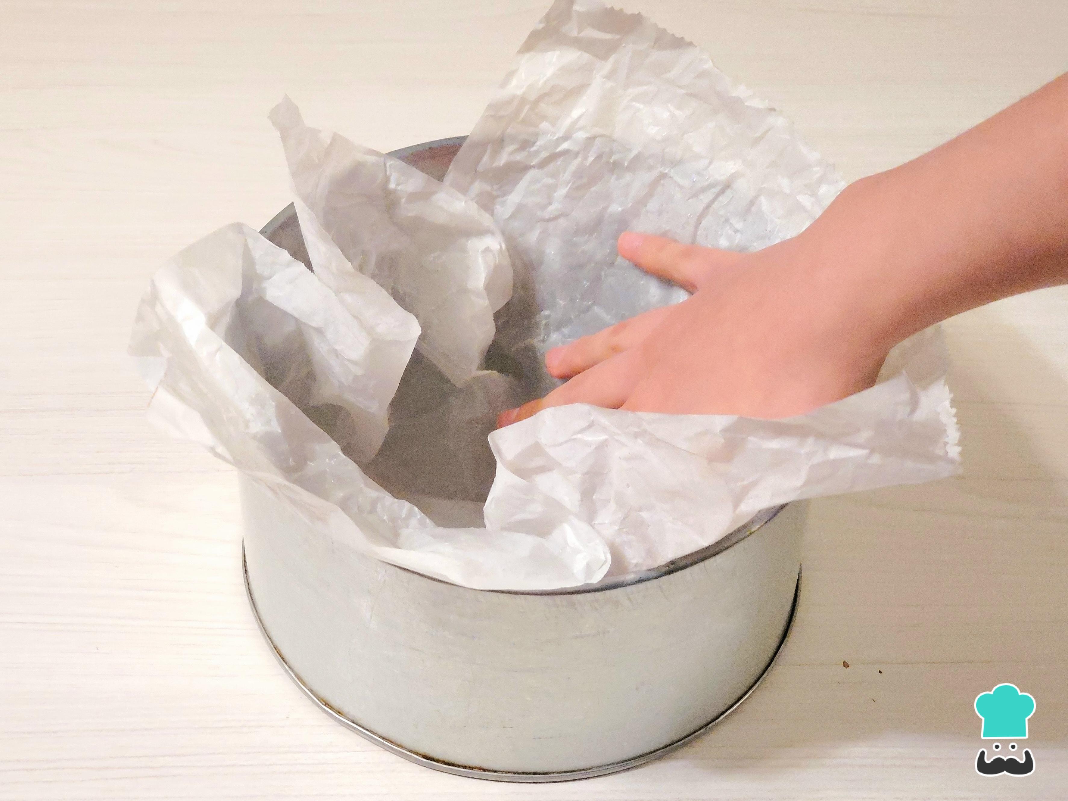 Antes de hornear, arruga un papel manteca, humedécelo ligeramente y colócalo dentro de un molde de unos 18 cm de diámetro. Asegúrate de cubrir bien la base y las paredes.