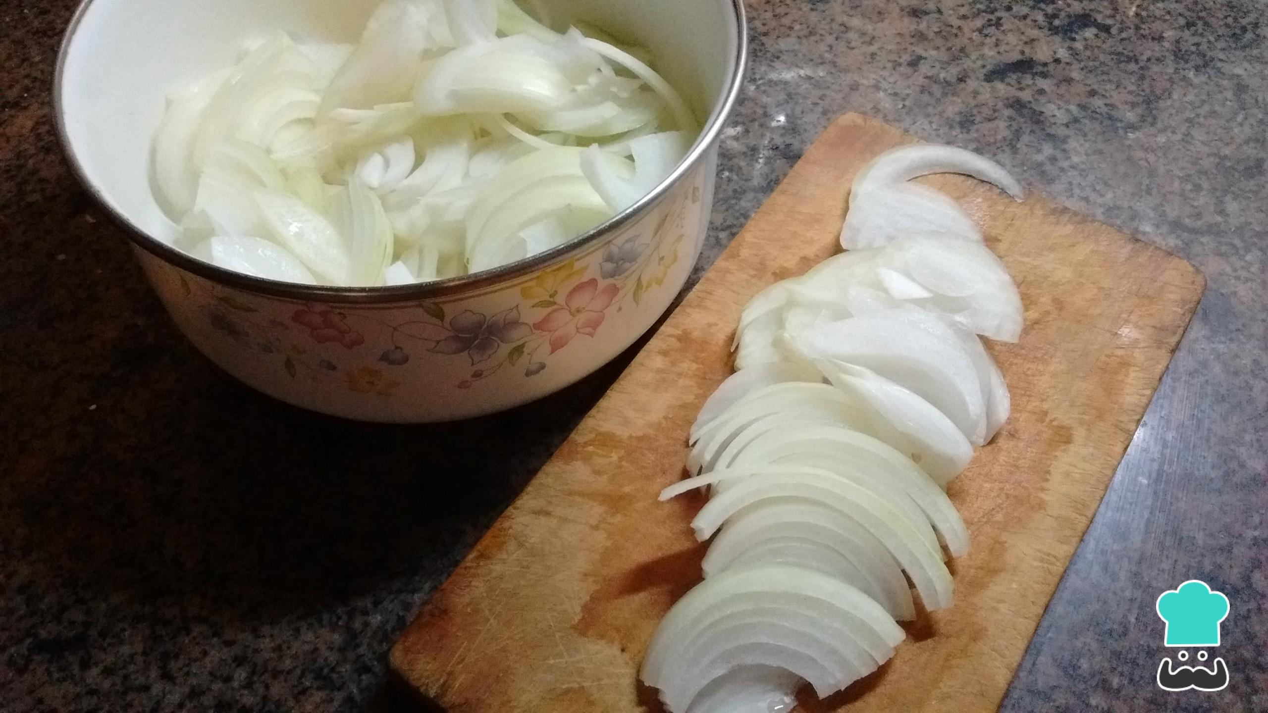Lo primero que debes hacer para preparar la tarta de queso y cebolla, es pelar y cortar la cebolla en forma de pluma.