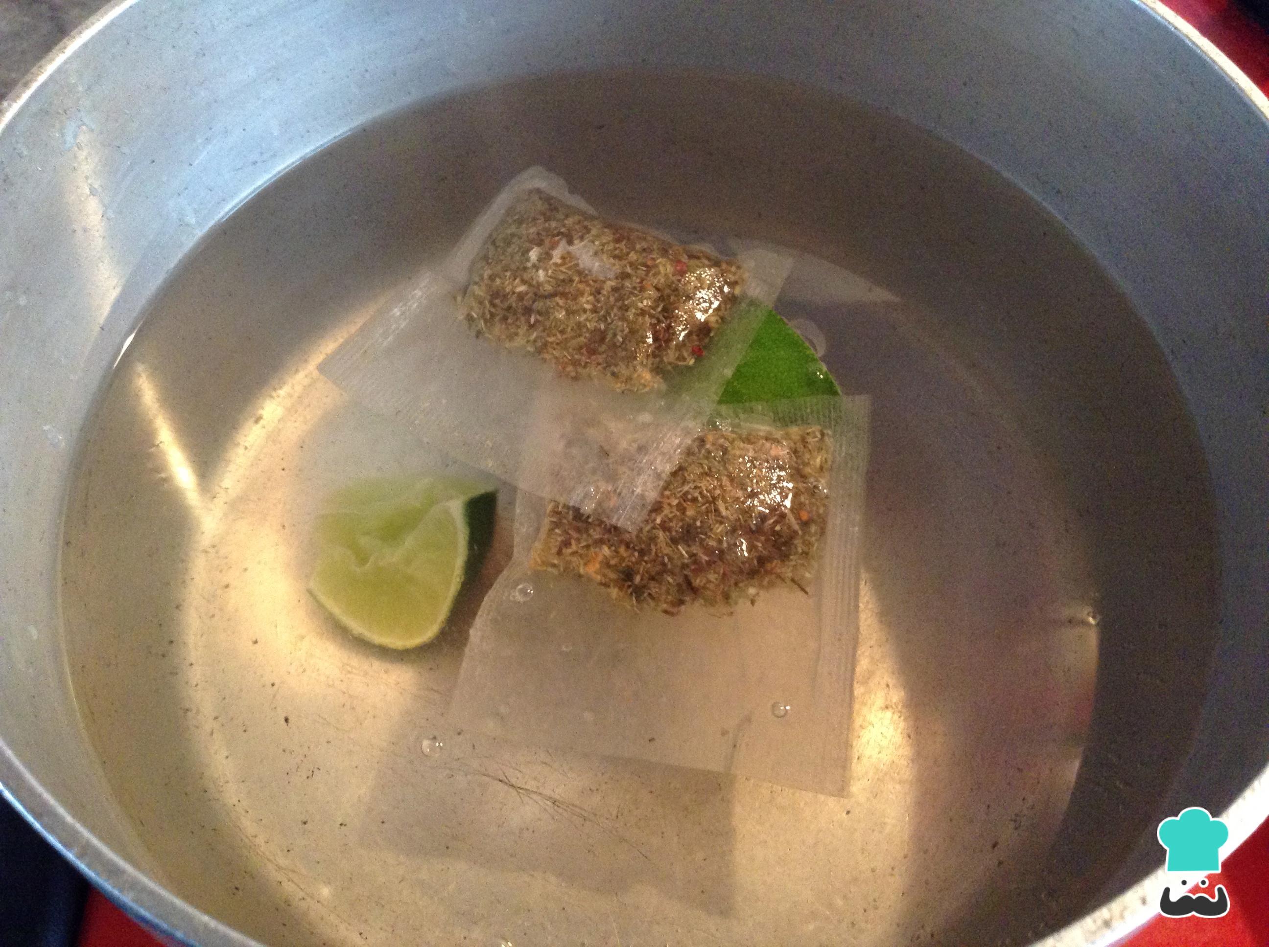 Cuando el agua esté hirviendo, retira del fuego y agrega las bolsas de té, los zumos de los limones y la cáscara de los limones que exprimimos para sacar el zumo.