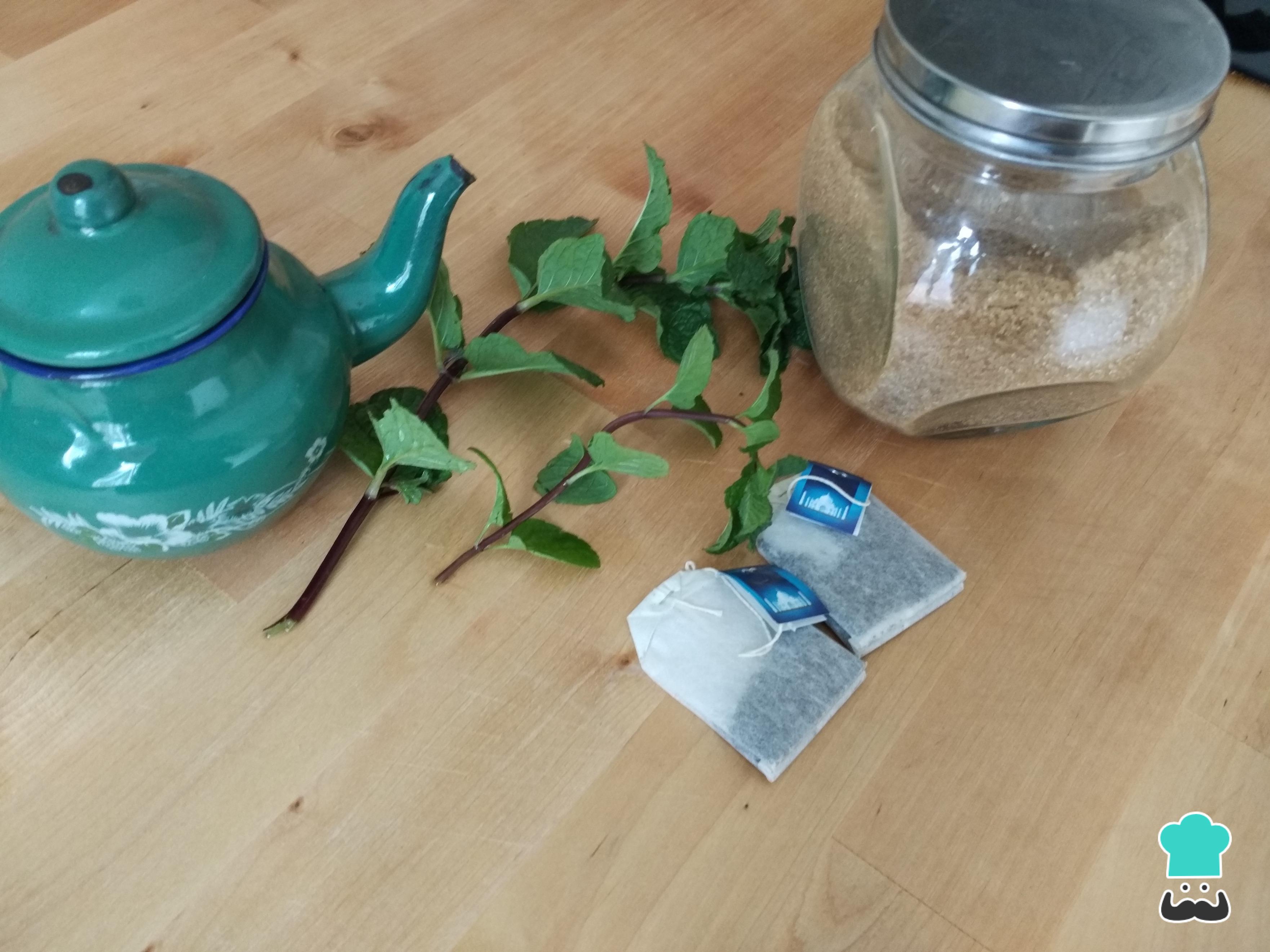 Reunimos todos los ingredientes para preparar el té moruno. El té marroquí se elabora tradicionalmente con té gunpowder, pero puedes utilizar cualquier tipo de té verde o negro.