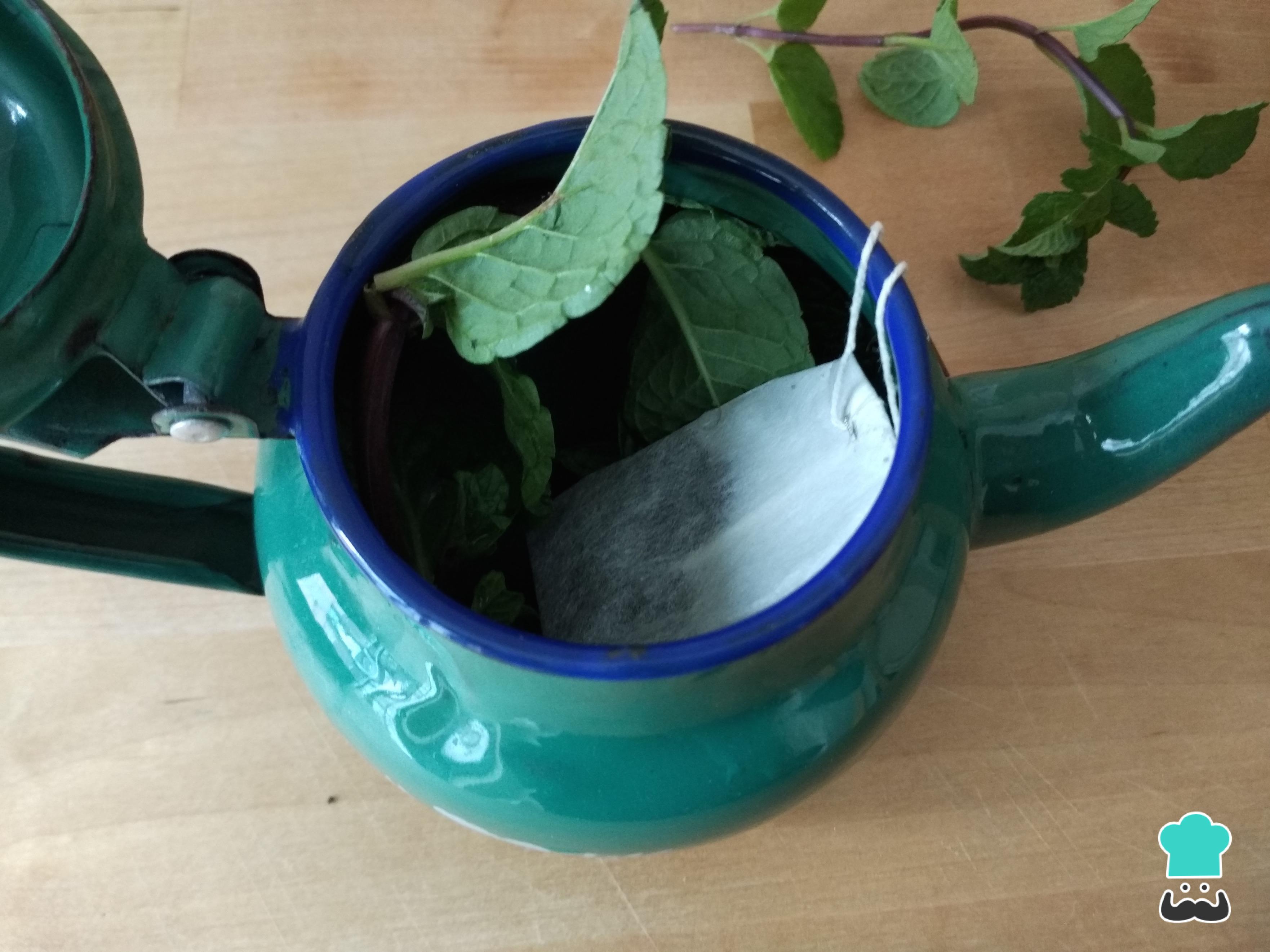 En una tetera colocamos el té y unas ramas de hierbabuena fresca. Si utilizáis té gunpowder suelto, el proceso correcto es poner agua hirviendo en la tetera con el té, dejarlo reposar durante 30 segundos y tirar ese agua. De este modo el té se abre y se elimina el sabor amargo.