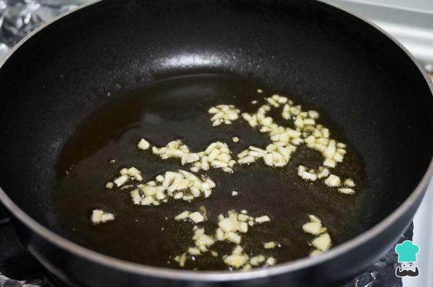Pela y pica los ajos muy pequeños. A continuación, coloca una sartén amplia a fuego medio con un buen chorro de aceite de oliva e incorpora los ajos picados y déjalos que suelten todo su aroma en el aceite, con cuidado que no se quemen.