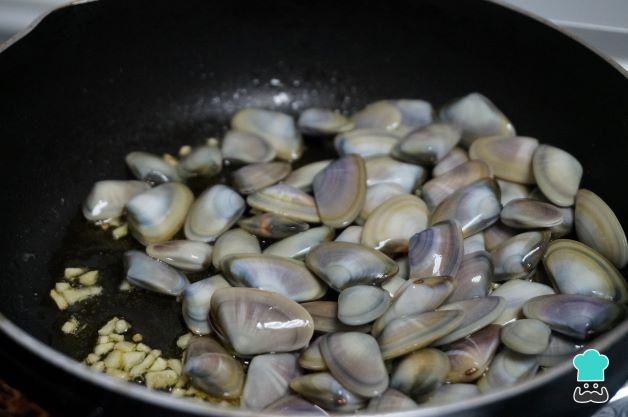 Añade las coquinas de Cádiz bien limpias cuando observes que los ajos empiezan a coger color. A continuación, sube el fuego y remueve para que adquieran el sabor de los ajos y se vayan abriendo las tellinas durante 2 minutos.