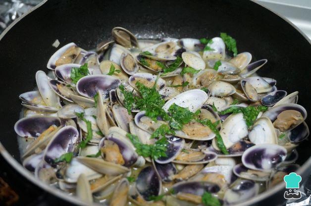 Pica un puñado de perejil y, cuando observes que están las tellinas, retira las que veas que no se han abierto. Añade el perejil picado, un poco de sal y pimienta.