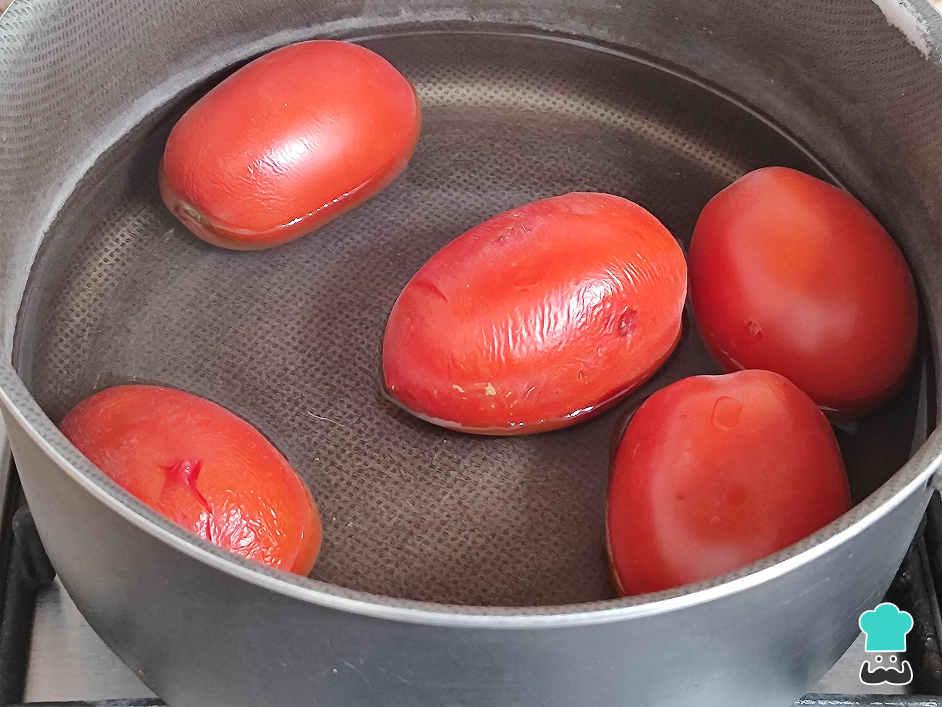 Comienza la receta de tinga de pollo con tomate poniendo a hervir agua y cociendo los tomates por unos 10 minutos o hasta que veas que la piel se empiece a desprender del tomate.