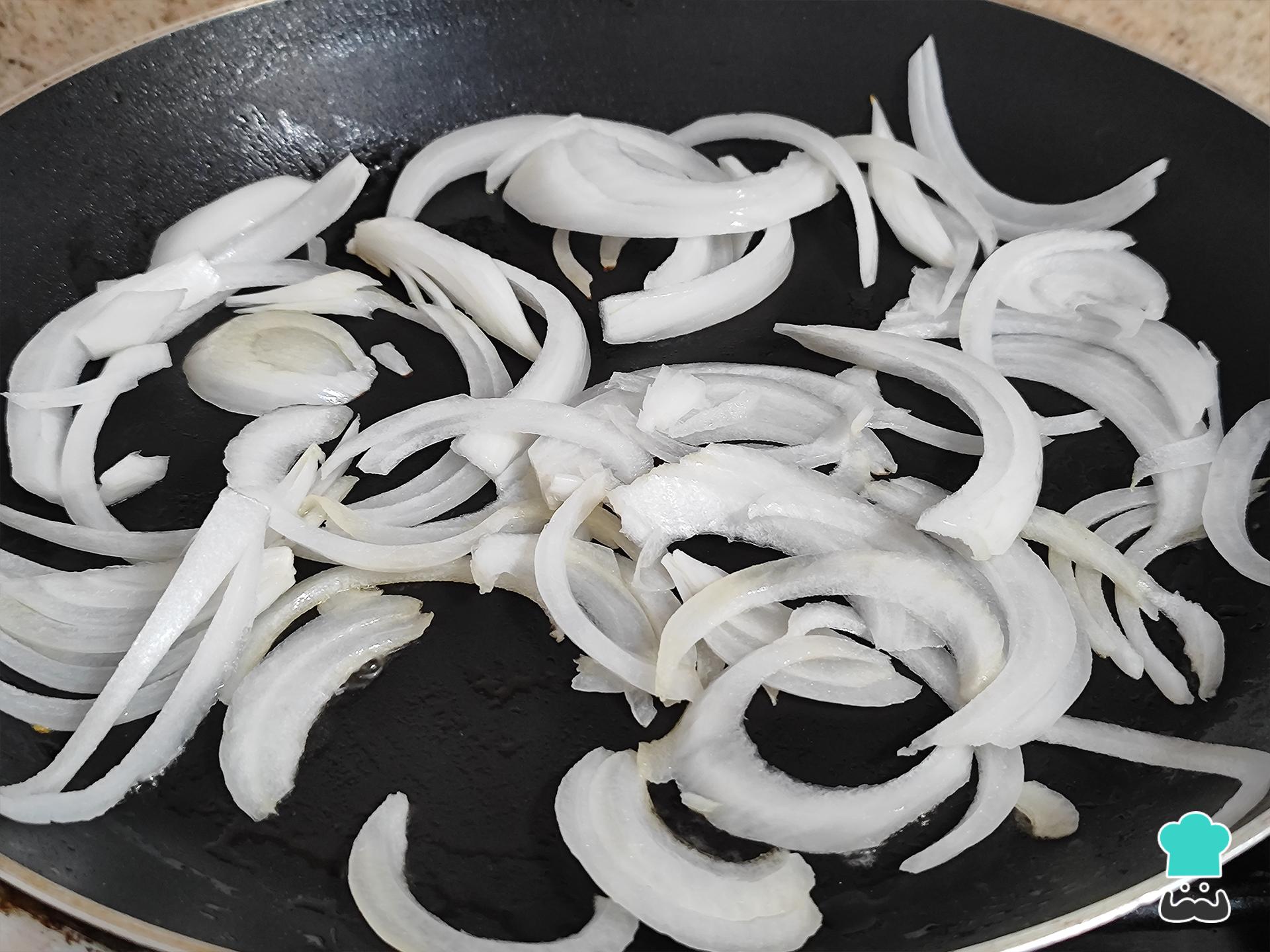 En una sartén calienta dos cucharadas de aceite vegetal y, enseguida, sofríe la cebolla en julianas, mantén a fuego medio. Remueve constantemente hasta que la cebolla comience a ponerse transparente.