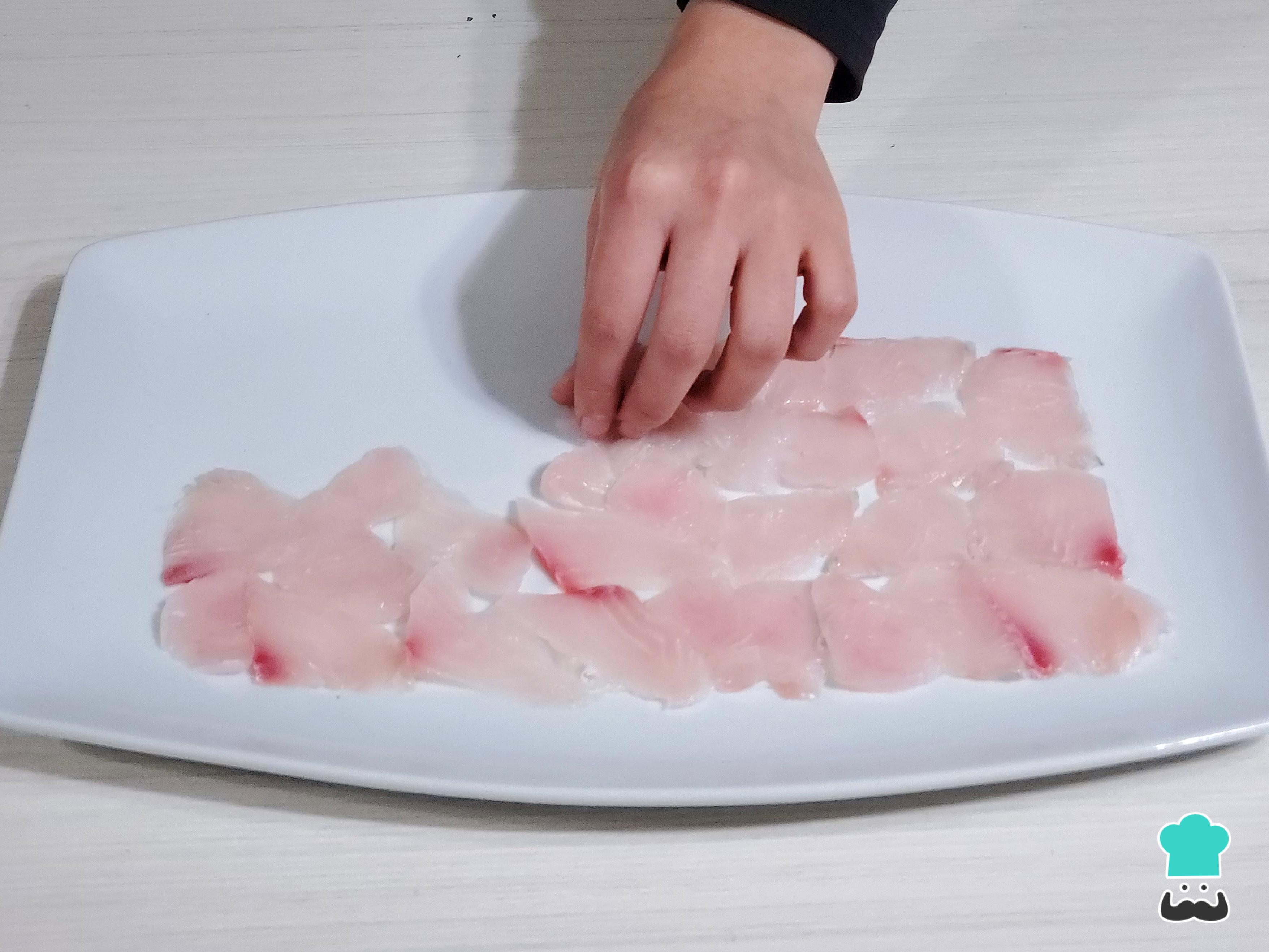 Corta el filete de pescado en láminas delgadas. Asegúrate de que el cuchillo esté bien afilado y de hacer cortes sesgados, tipo sashimi o carpaccio. Reserva la merma para preparar la leche de tigre.