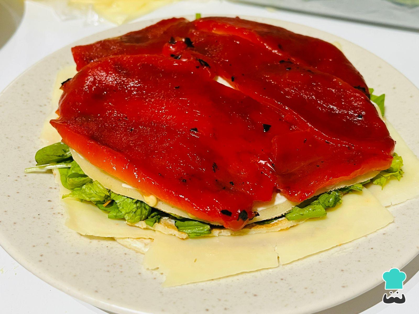 Pela el morrón y córtalo para cubrir una de las capas de la torre de panqueques navideña. Para hacerla, deberás ubicar un primer panqueque sobre un plato. Úntalo con la mezcla de mayonesa, queso y mostaza y agrega el primer ingrediente, por ejemplo, el queso en fetas. Agrega otro panqueque y repite hasta usar tantos panqueques e ingredientes como capas desees tenga tu torre.