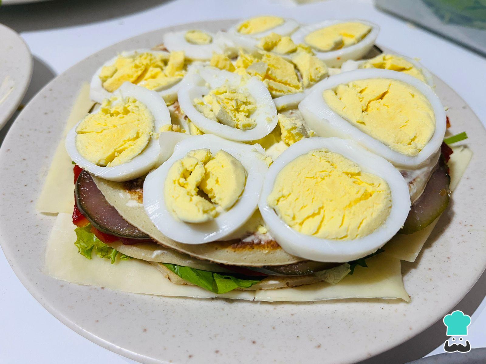 Pela y corta los huevos en rodajas para cubrir otra capa. Recomendamos el siguiente orden de ingredientes, todos alternados por panqueques: queso, lechuga y rúcula picada, morrón, pepinos, huevo, tomate y jamón.
